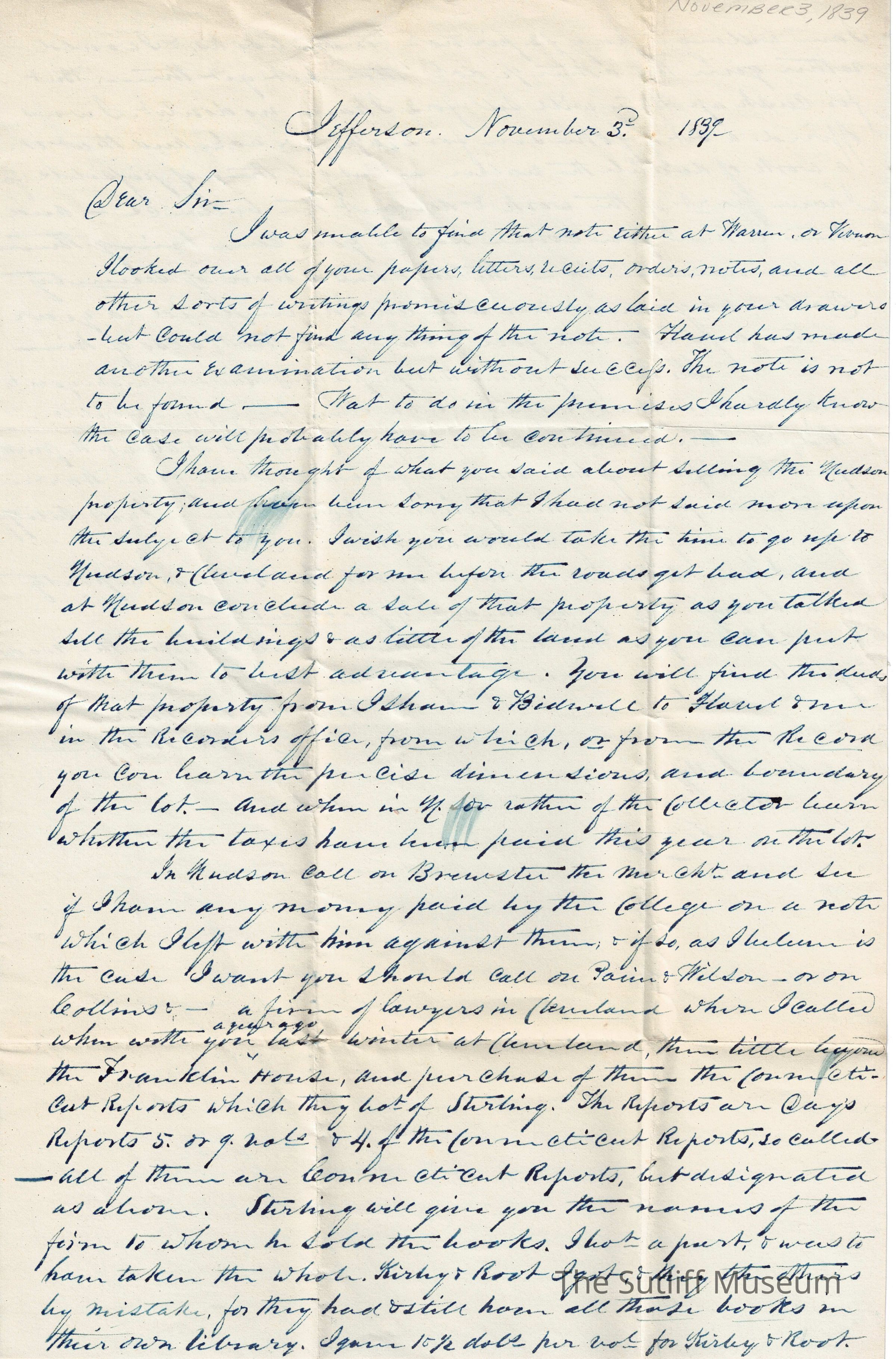 Letter from Milton Sutliff to Levi Sutliff. Milton writes to Levi regarding Levi's request to him to find a note among his piles of letters and other writings. Flavel looked as well, without success. He suggests that the case will have to continue without the note. Milton advises Levi on the sale of property in Hudson. While in Hudson, Levi is to call on Brewster, the merchant, to see if Milton has any money paid by the college on a note which he left with the merchant. Milton also asks Levi to call on the lawyers, Pain & Wilson (or Collins & Wilson) in Cleveland and purchase the Connecticut Reports.Collection