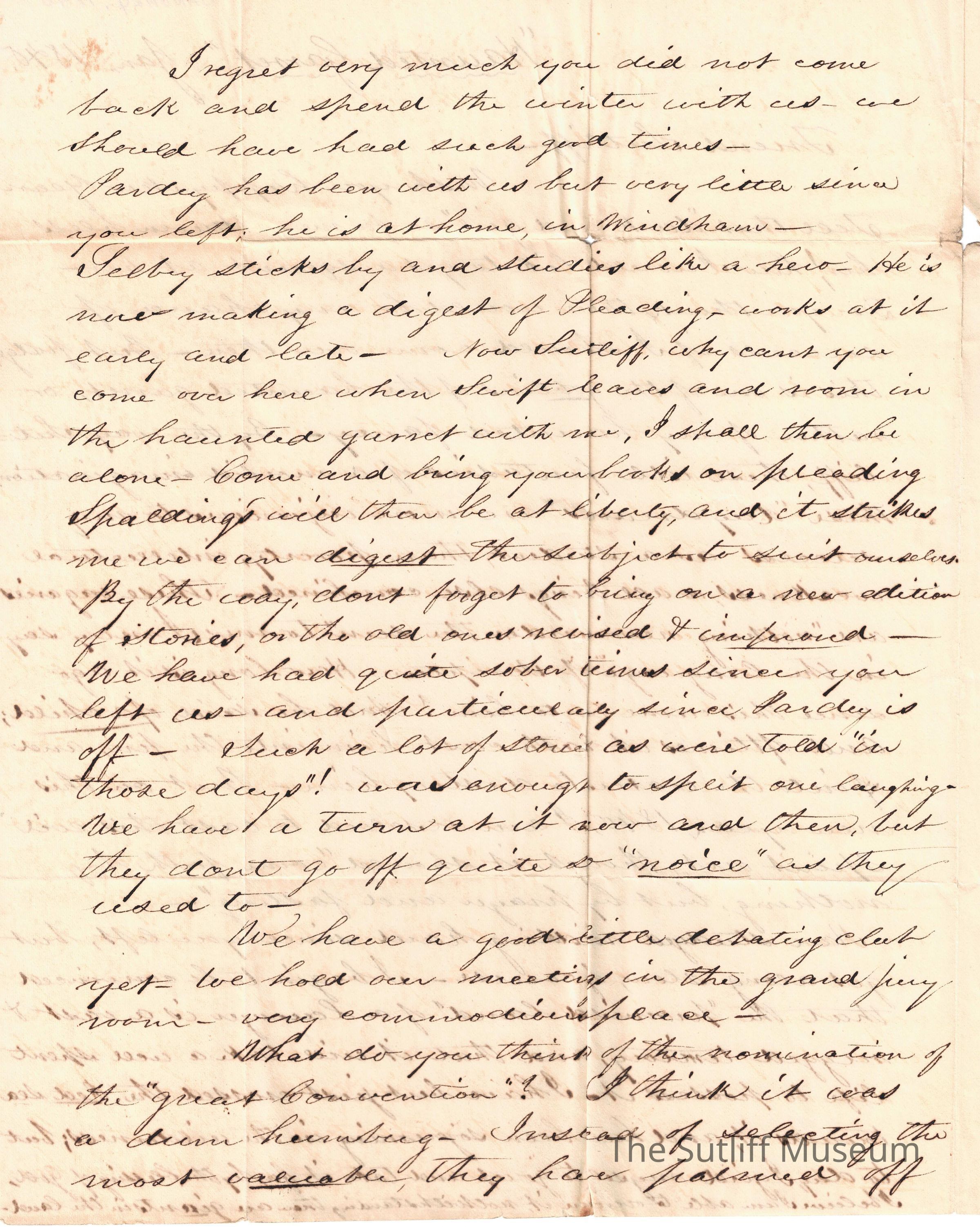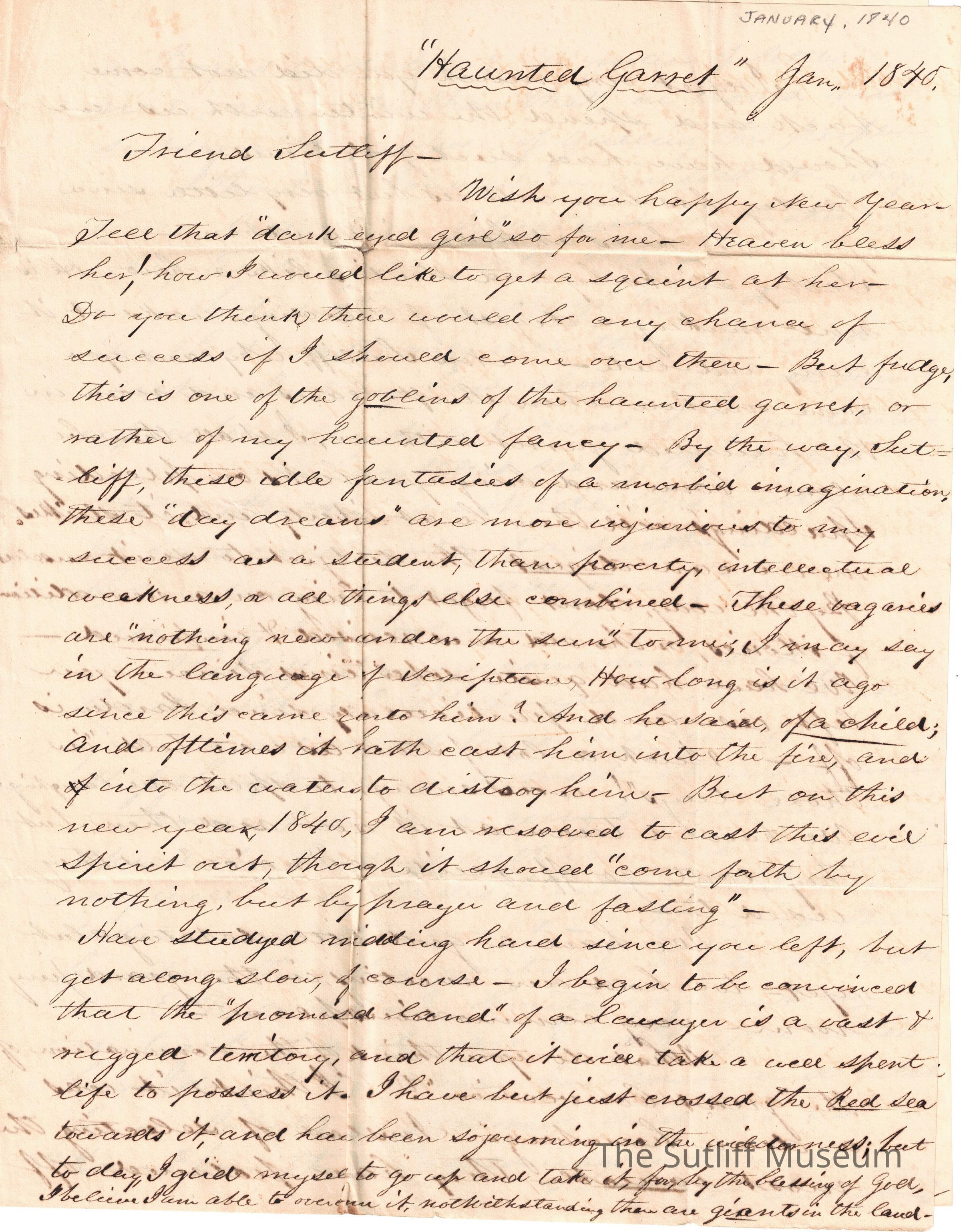 Letter from Luther Day to Levi Sutliff. Day writes to Sutliff regarding the "dark eyed girl" and his fantisies of her. He also writes of his studies and of becoming a lawyer. Day writes about his family, especially Selby, who is sticking with his studies, working early and late. Day asks Sutliff to room in the "haunted garret" with him once Swift leaves. Day inquires of Sutliff's thoughts on the nomination of the "great Convention".Collection