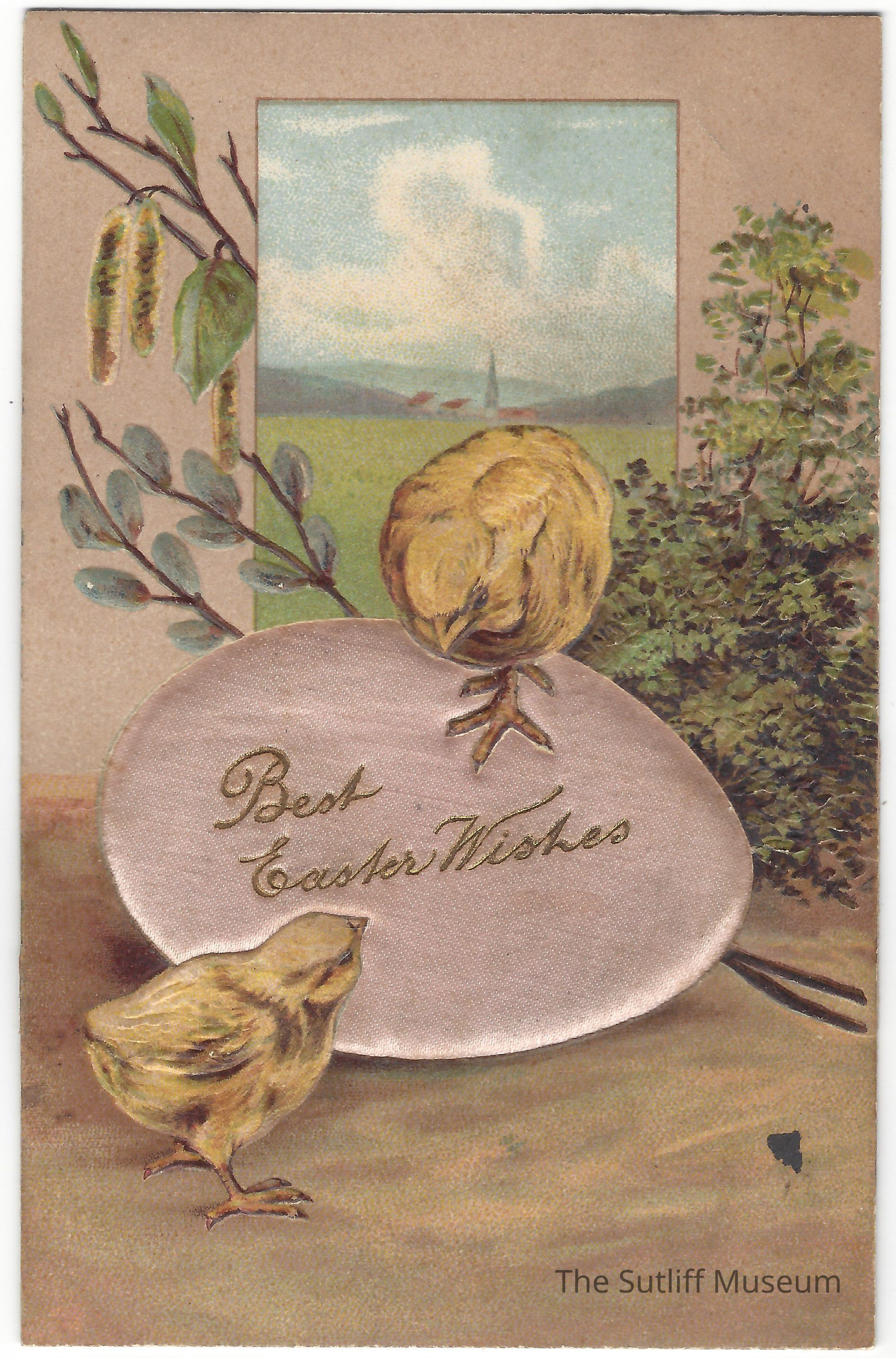 Thanksgiving postcard that depicts a pink egg with two baby chicks with the saying "Best Easter Wishes" on the egg.