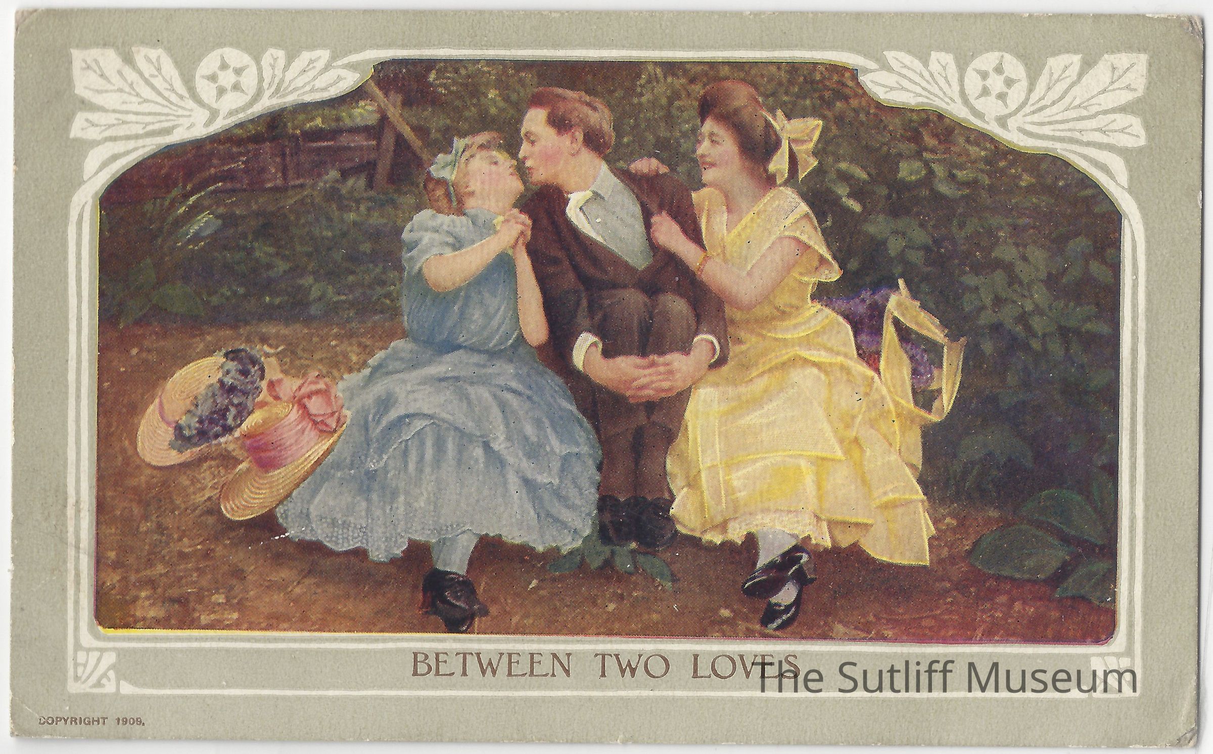 A postcard depicting a man between two women with the phrase "Between Two Loves."