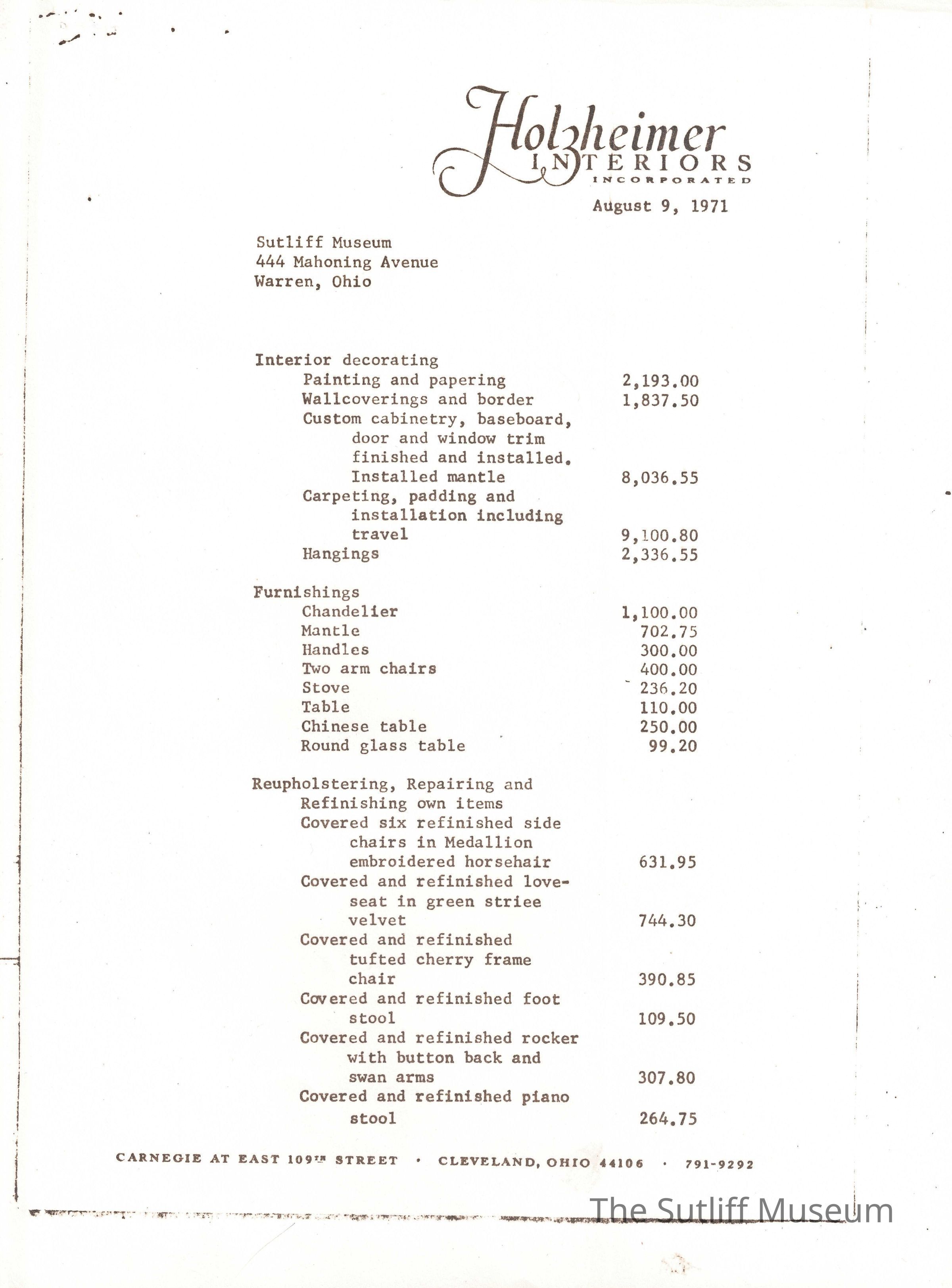 This contains copies of the bill from Holzheimer Interiors, Incorporated for the interior decorating of the Sutliff Museum and an appraisal of pictures from The Bonfoey Picture Framing Co. This also includes a handwritten note stapled to the bill and appraisal for the addition of the framed painting of Phebe T Sutliff to the appraisal form.Collection