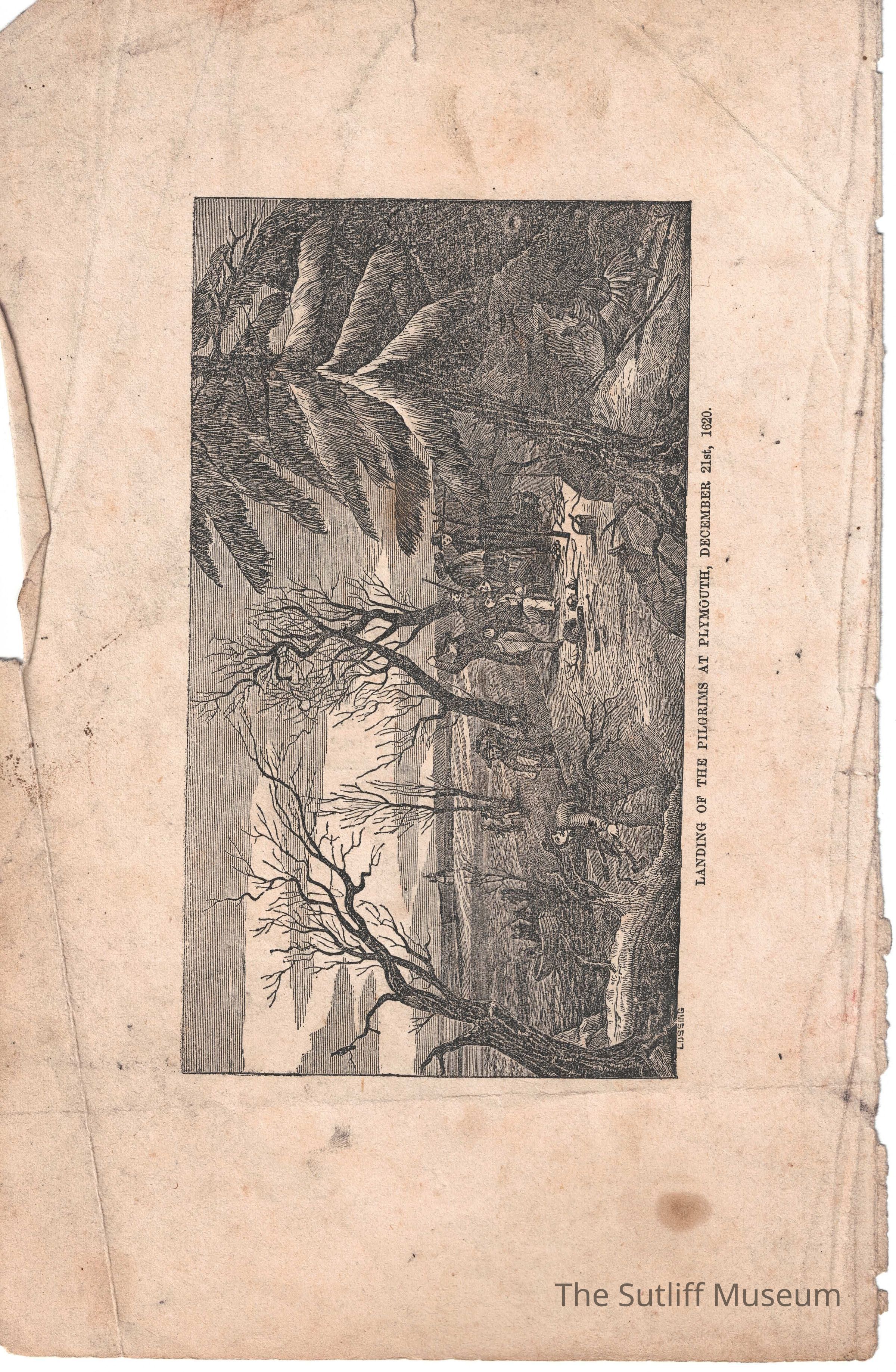 The title page of Book 2 of History of the United States. There is a small pencil drawing on the front of the page and an image titled "Landing of the Pilgrims at Plymouth" on the back. Undated.Collection
