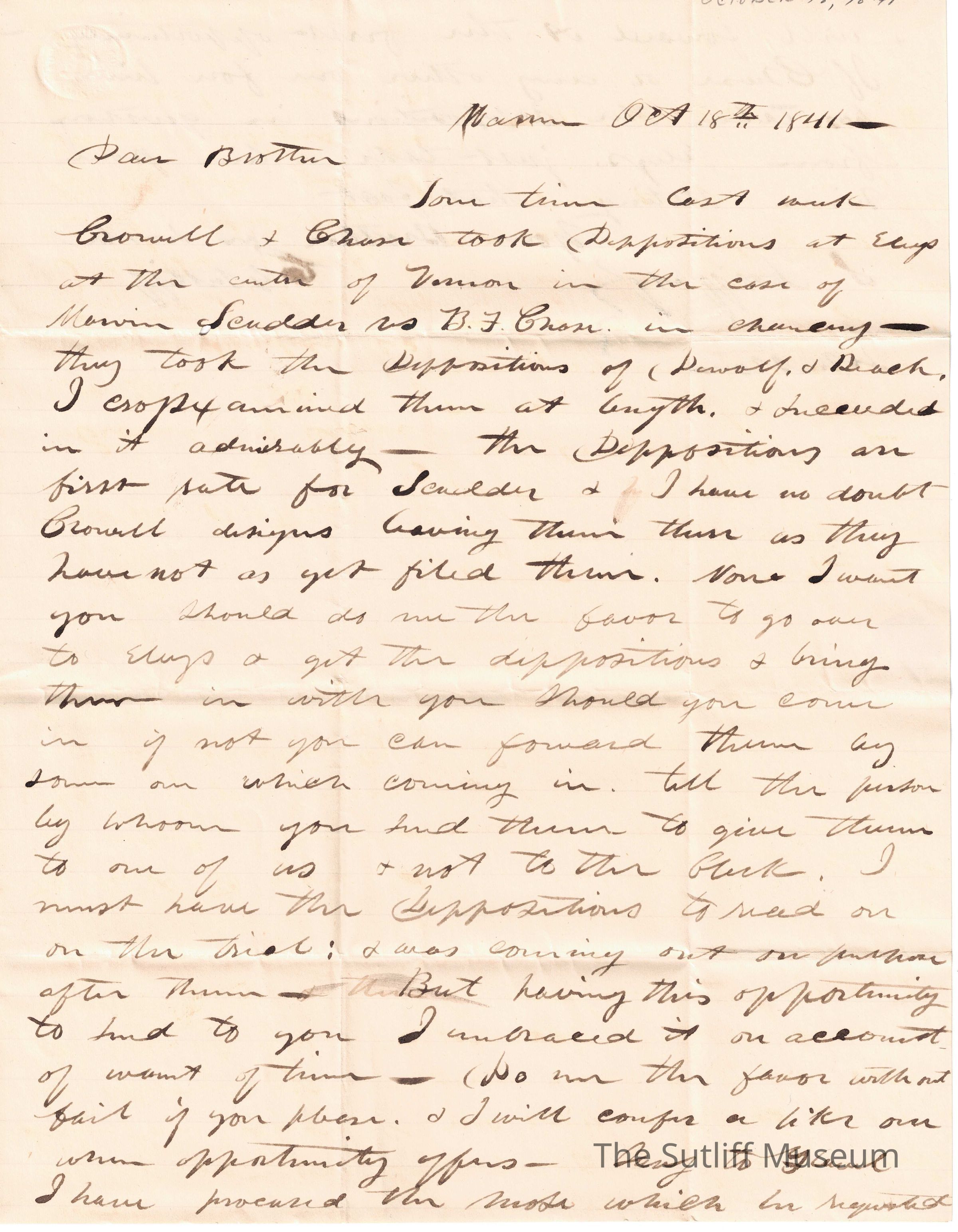 A letter from Calvin Granger Sutliff to Levi Sutliff regarding updates on legal cases and the request for a legal favor.