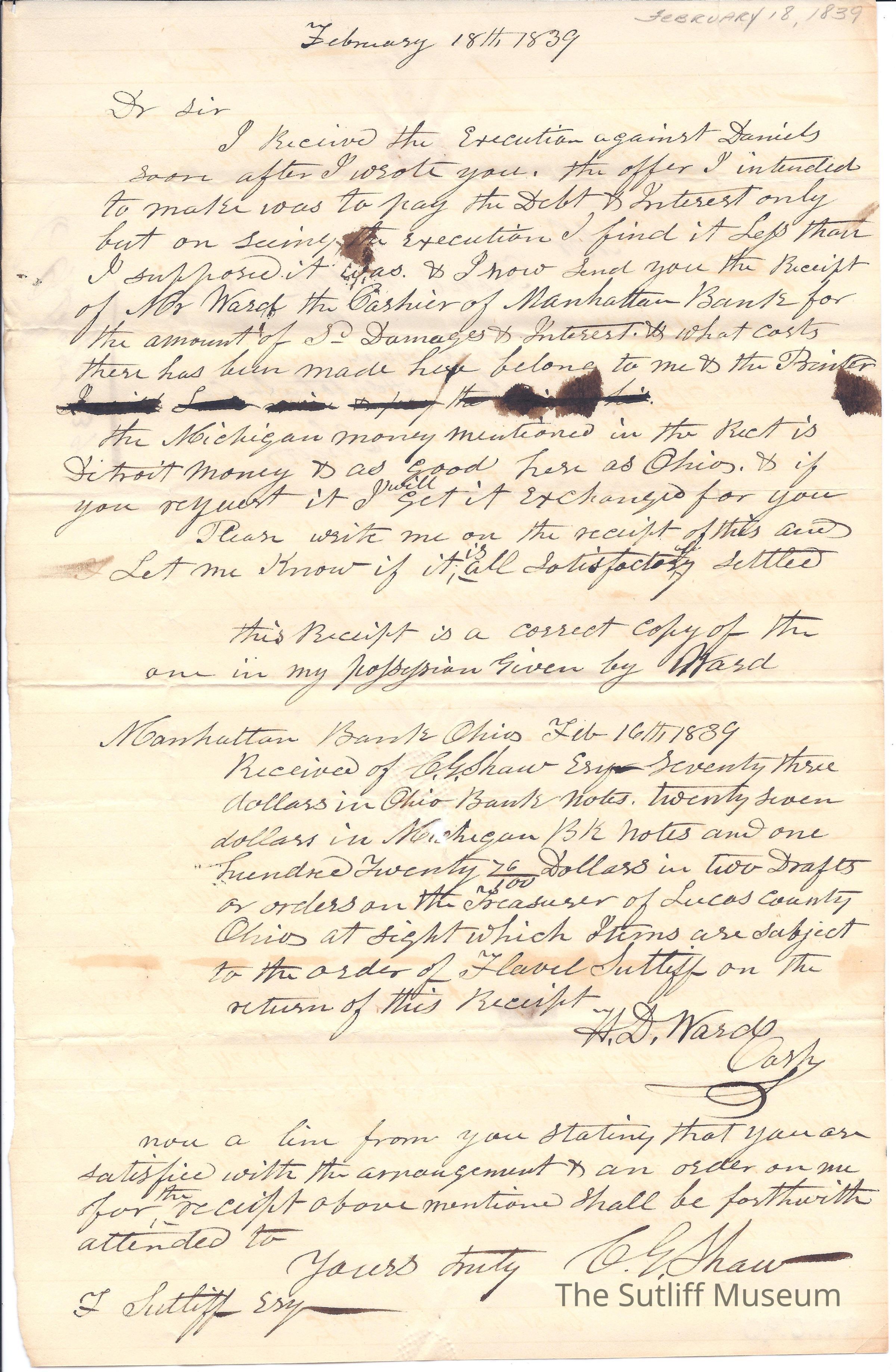 Letter from C.G. Shaw to Flavel Sutliff regarding his retirement of a debt to Flavel at the Manhattan Bank using a combination of Michigan and Ohio currency.
