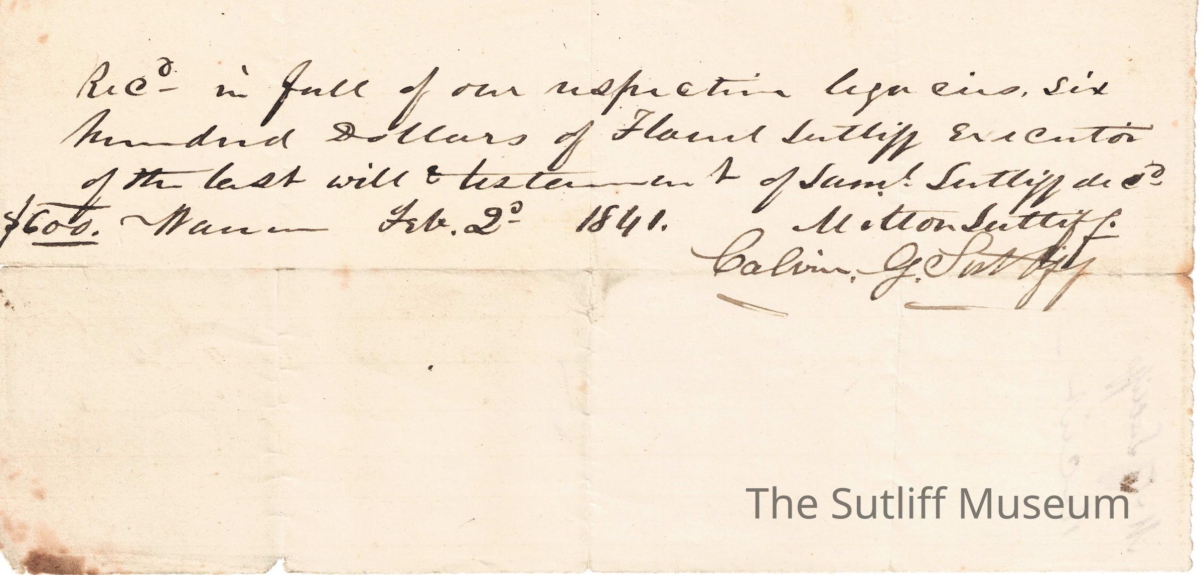 A receipt from Milton Sutliff to Calvin Granger Sutliff for $600.