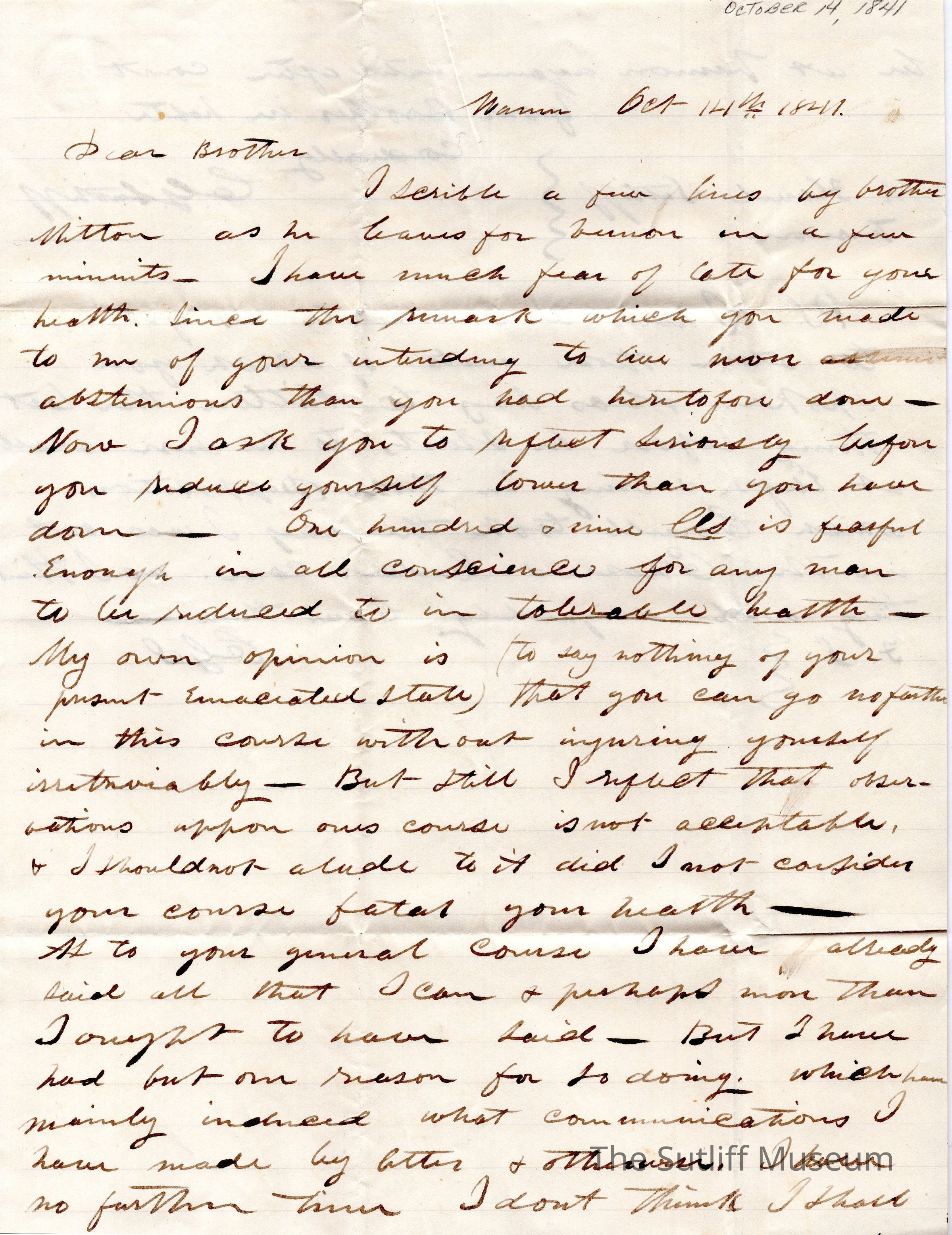 Letter from Calvin Granger Sutliff to Flavel Sutliff regarding a letter he received from Milton and concerns for Flavel's health.Collection