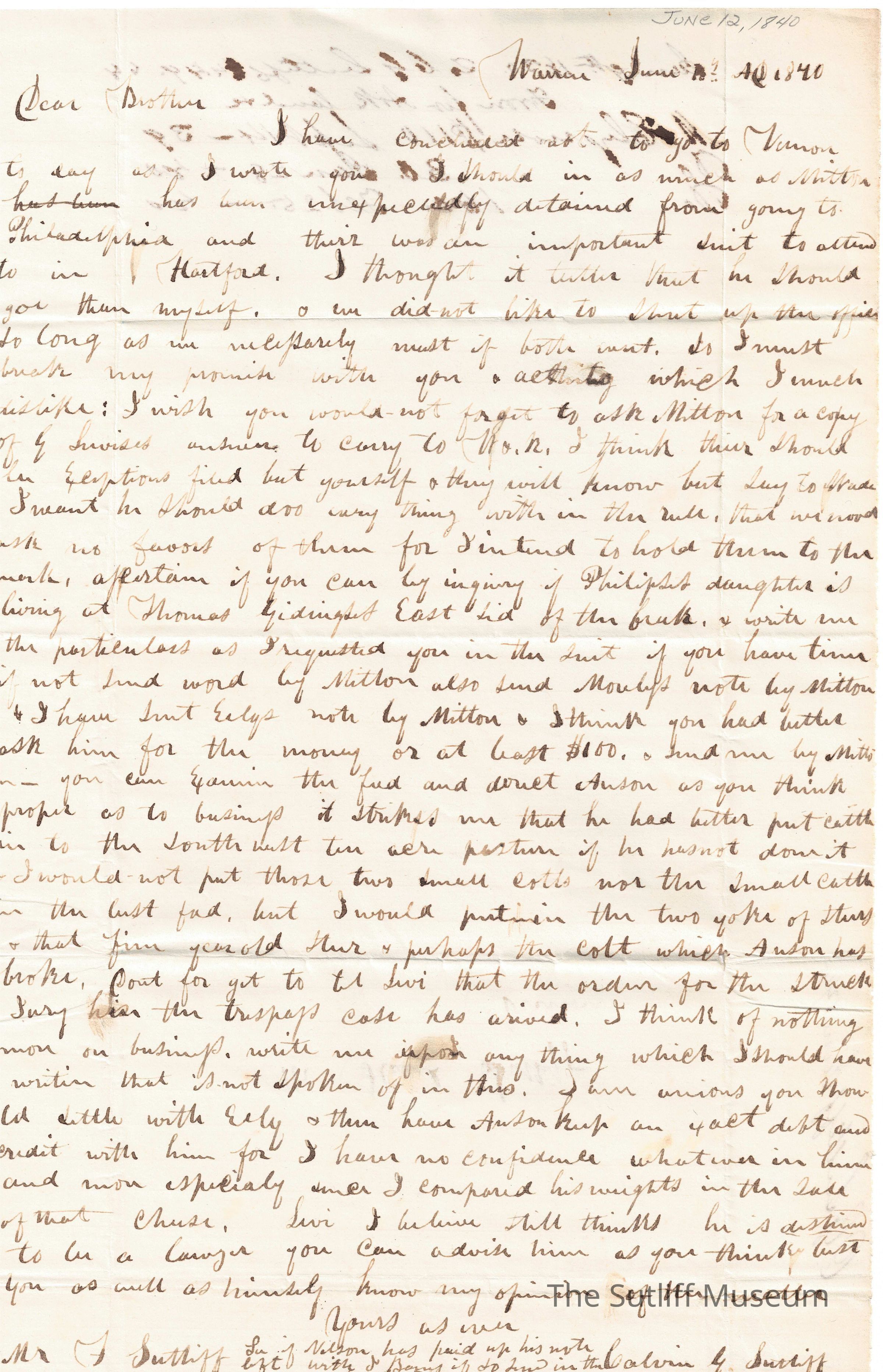 Letter from Calvin Granger Sutliff to Flavel Sutliff regarding their brother Milton and how Flavel should ask him things.Collection