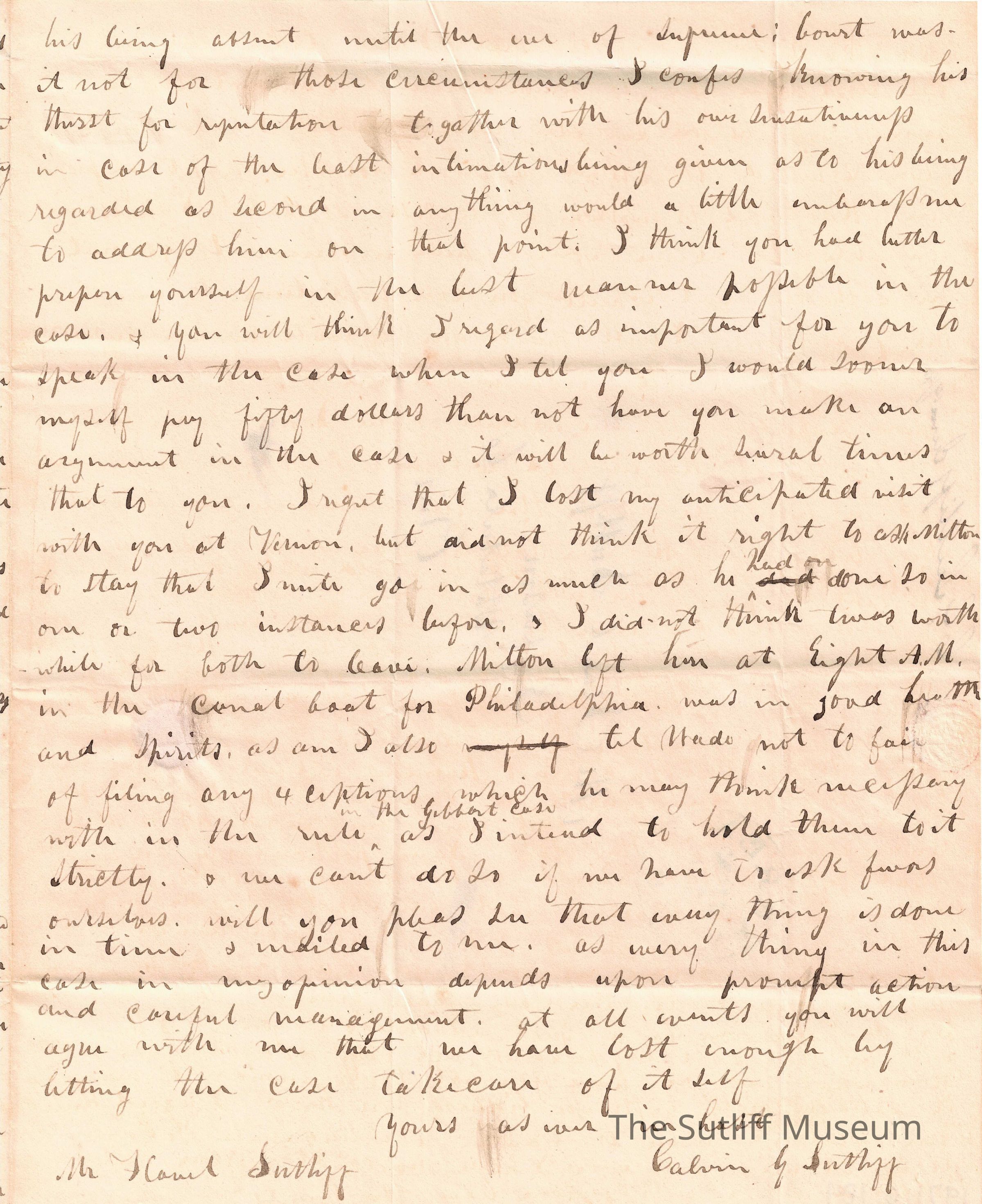 Letter from Calvin Granger Sutliff to Flavel Sutliff regarding a legal case, a case he has been called to testify in, and the legal abilities of Flavel and Joshua Reed Giddings.Collection