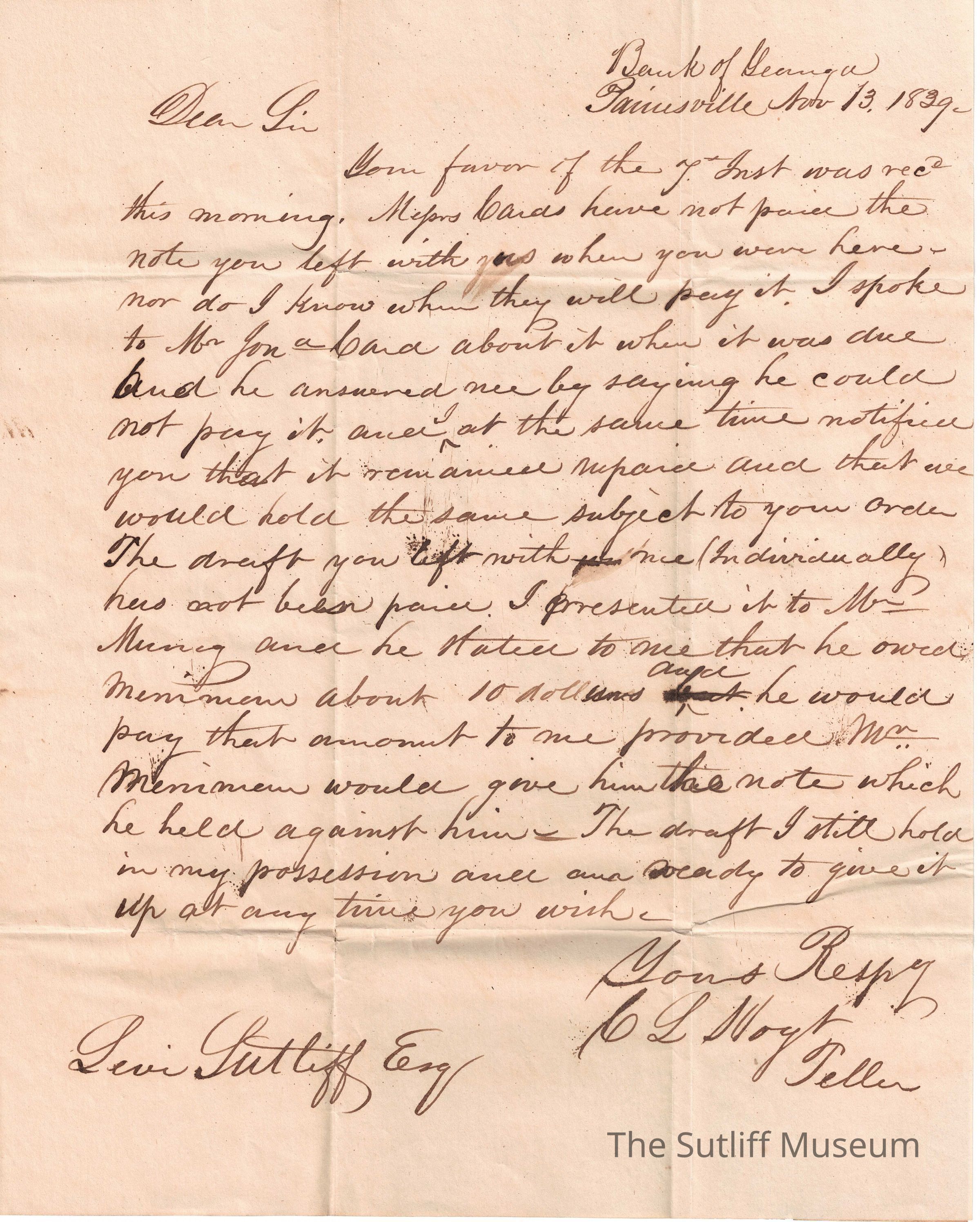 A letter from C.L. Hoyt to Levi Sutliff regarding the request to see if a note was paid, it was not.Collection