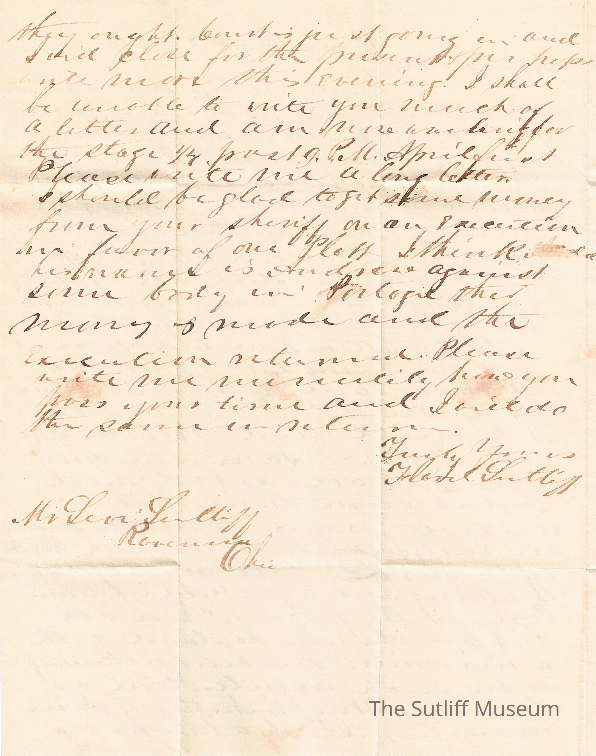 Flavel explains to Levi the development of two cases Levi is involved in with Root and Spalding. Asks Levi about his eyes, expressing concern over his reading too much. Mentions the possibility of a political Abolition Party, and expresses concern that people do not generally join minority parties. Talks about getting money from Levi's sheriff.Collection