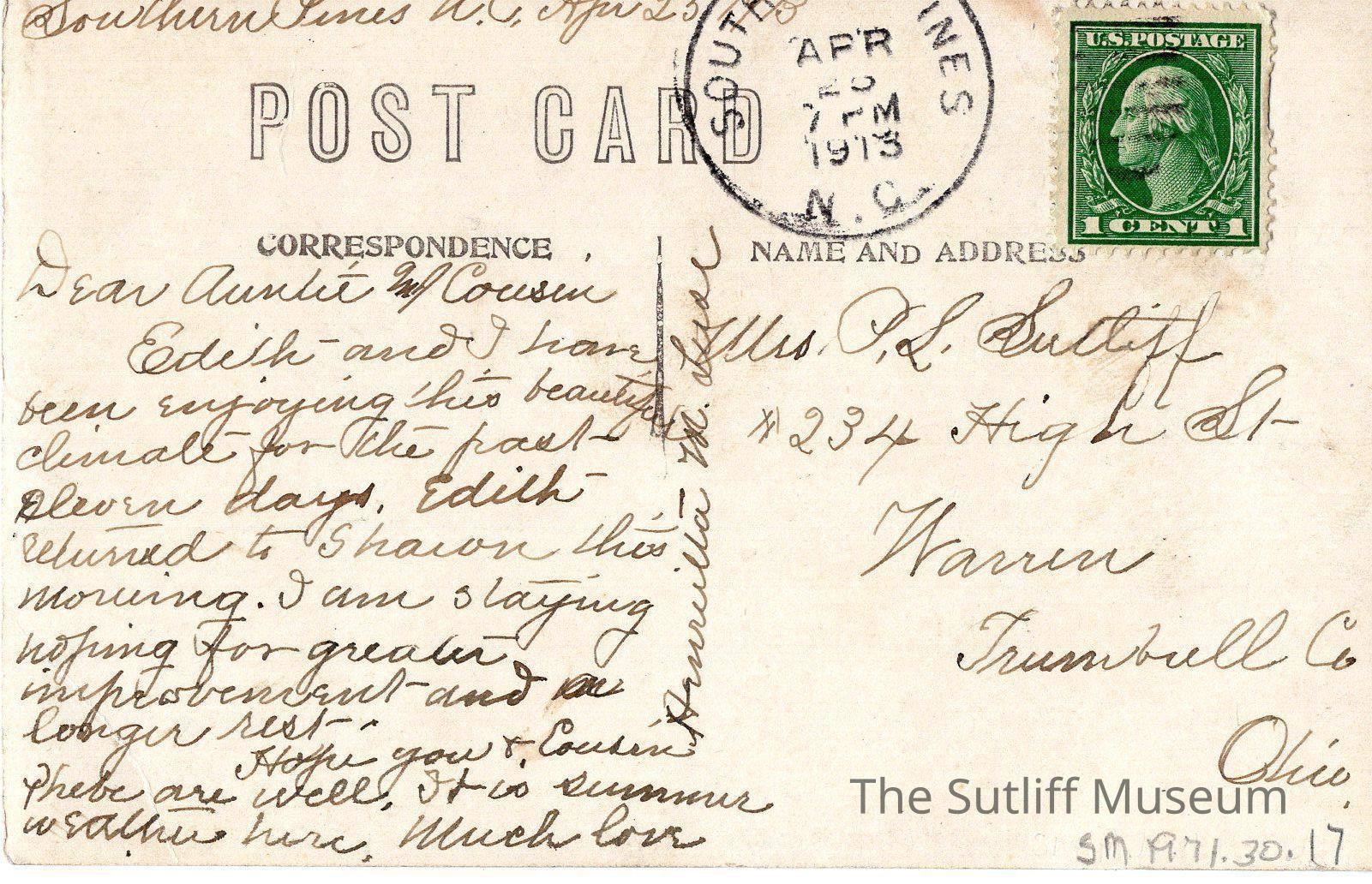 Postcard to Mrs. Phebe L. Sutliff from Edith and Aurelia.Entry/Object ID