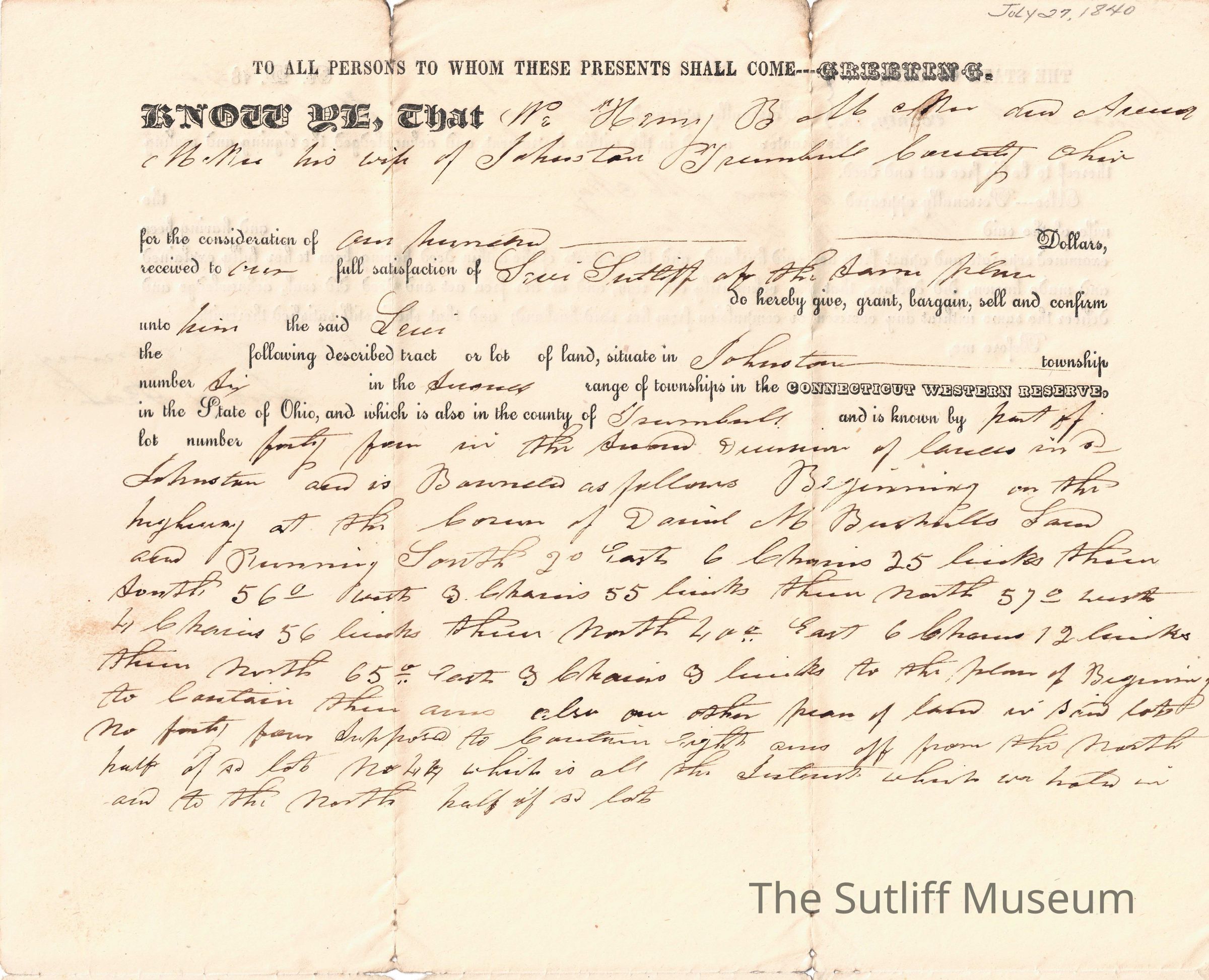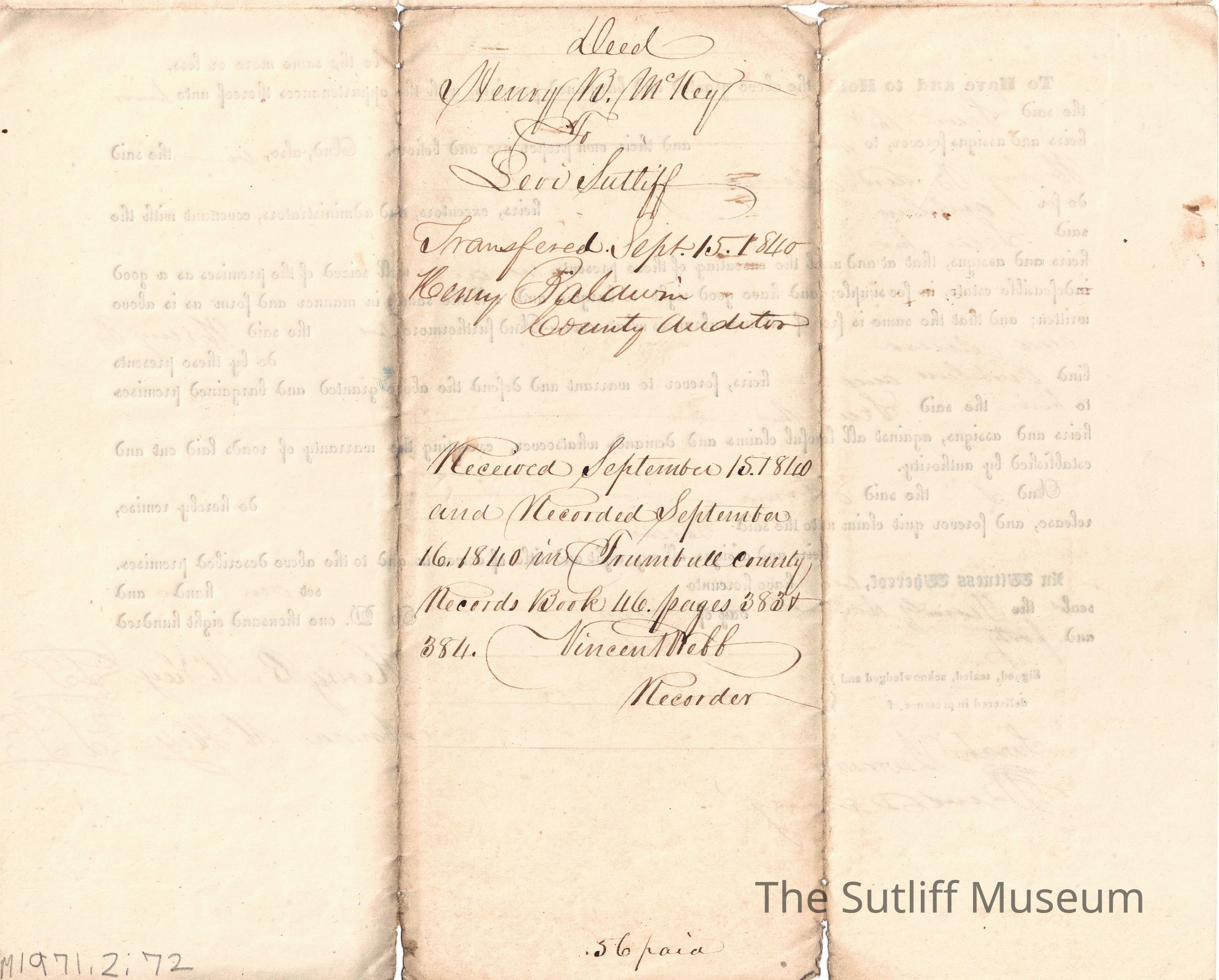 Deed to Levi Sutliff from Henry McKeyEntry/Object ID