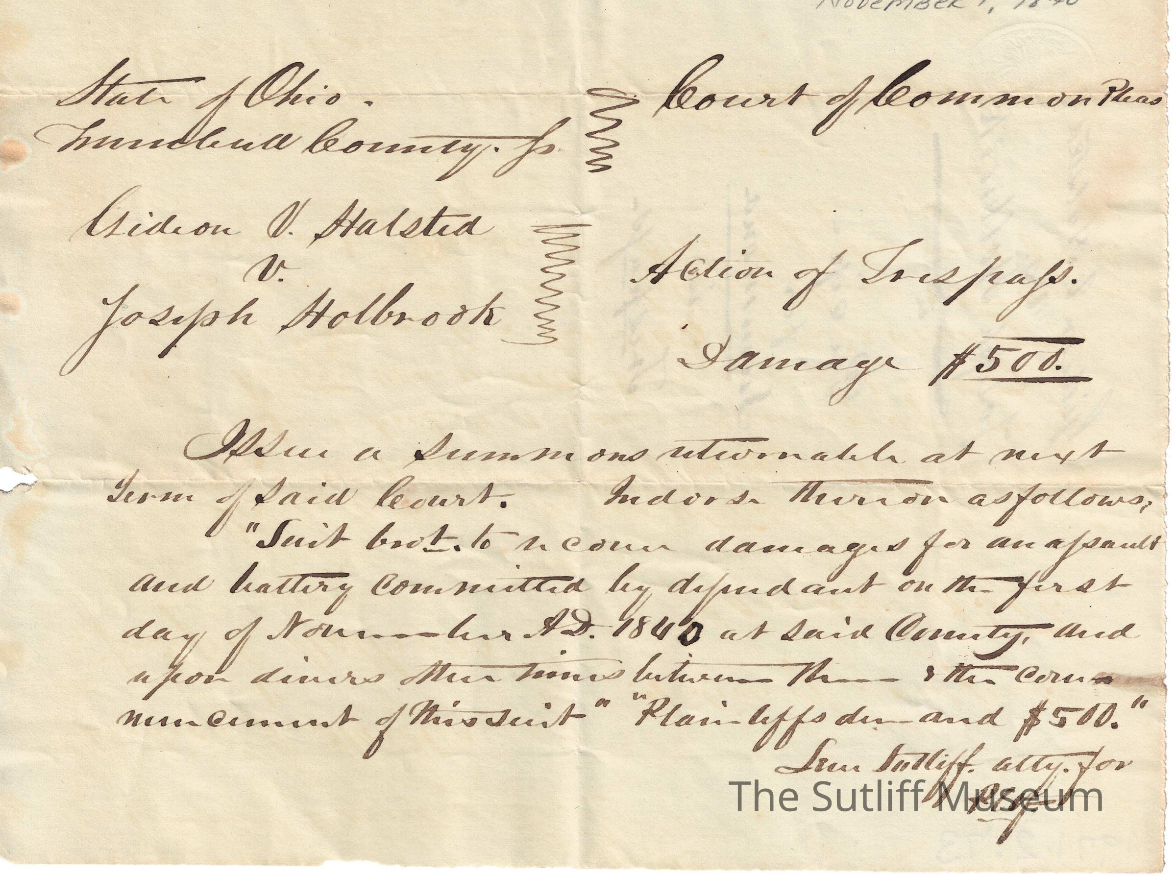 Note from Levi on the case "Gideo B. Halsted v. Joseph Holbrook," where there is a $500 fine levied against the defendent for assault and battery.Collection