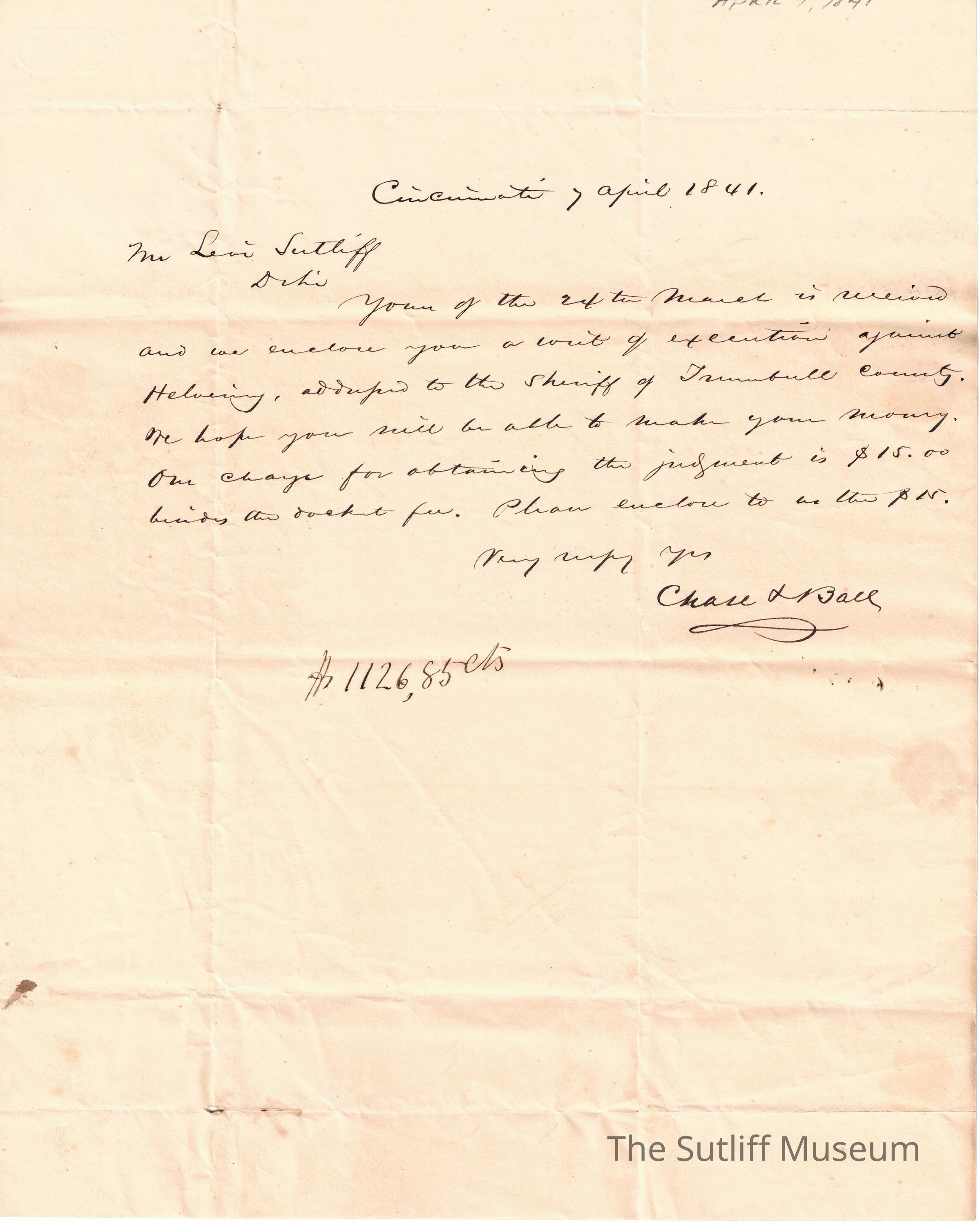 Mr. Levi Sutliff, Ohio, Yours of the 24th March is received and we enclose you a write of execution against Helving...Entry/Object ID