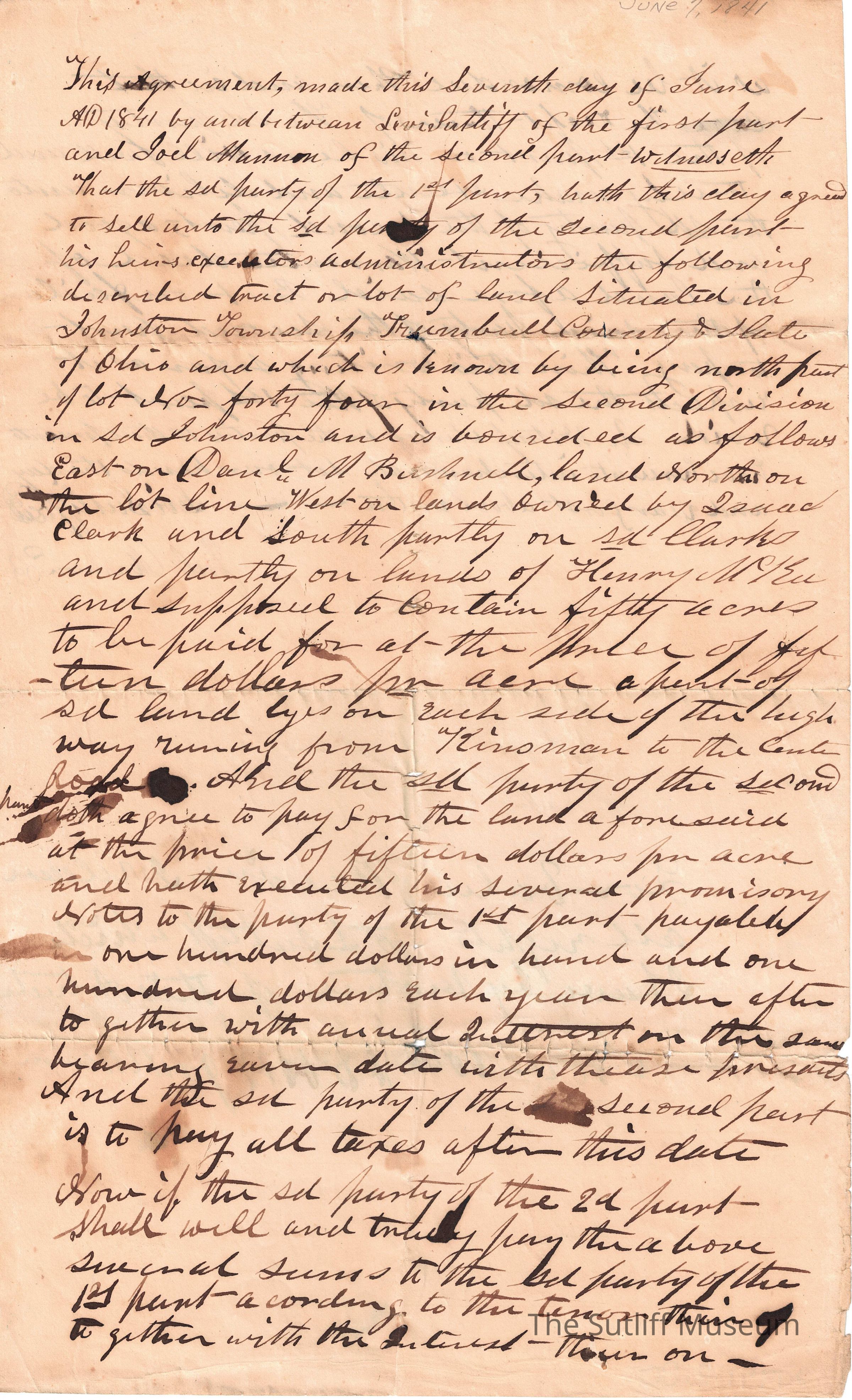 Contract between Levi Sutliff and Joel Mannon, where Levi is giving land in Johnston Township to Mannon. The contract goes into the specifics of property boundaries and also the tax and payment information.Collection