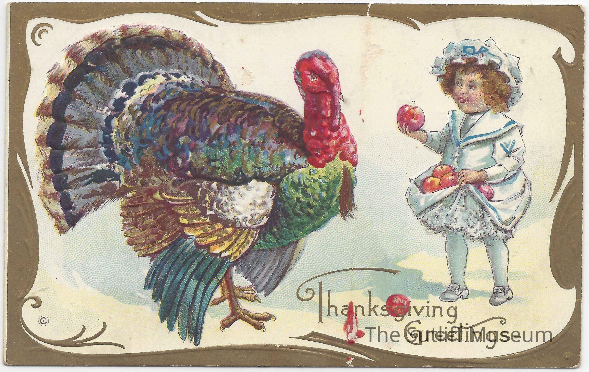 Thanksgiving postcard that depicts a child offering apples to a turkey with the saying "Thanksgiving Greetings" on the bottom right.