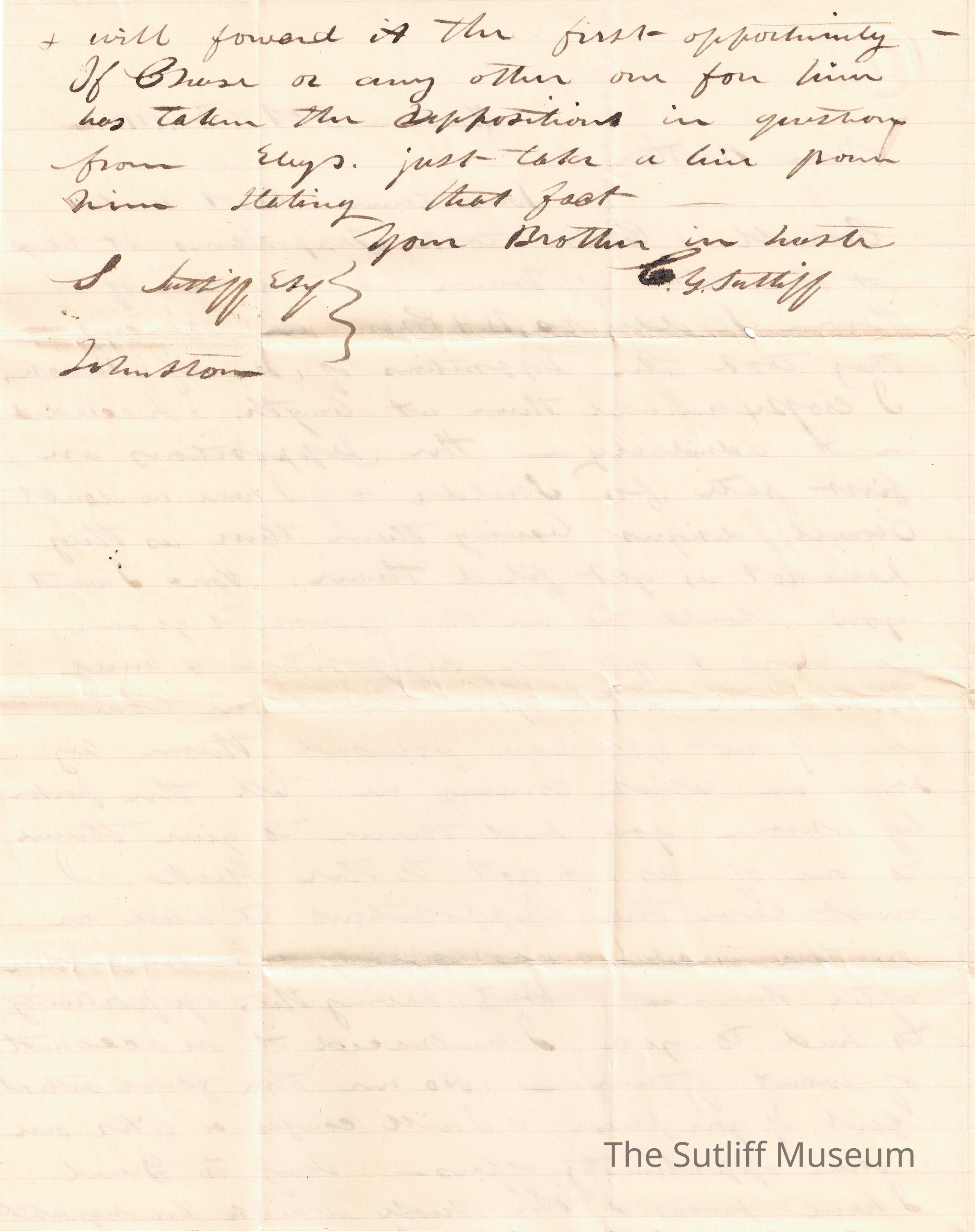 A letter from Calvin Granger Sutliff to Levi Sutliff regarding updates on legal cases and the request for a legal favor.
