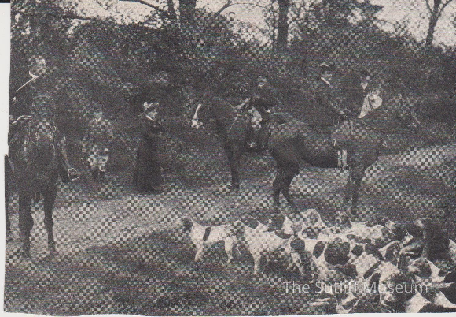 Clipped photograph from magazine. Photograph depicts foxhunt, including men and women in period dress, some men on horses, and dogs (potentially beagles)