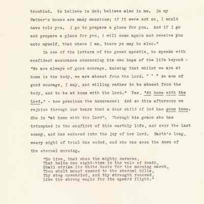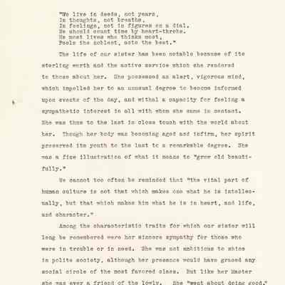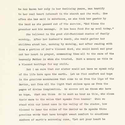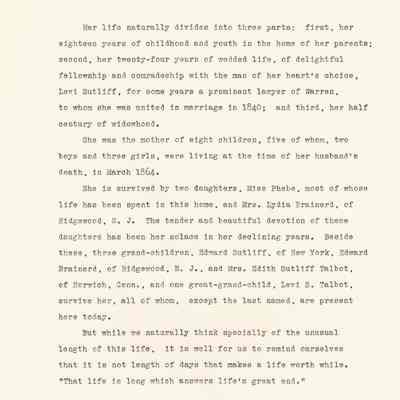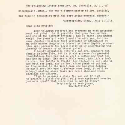 A written documentation of Phebe Lord Marvin Sutliff's funeral service conducted by pastor William E. Barker on July 5, 1914.Collection