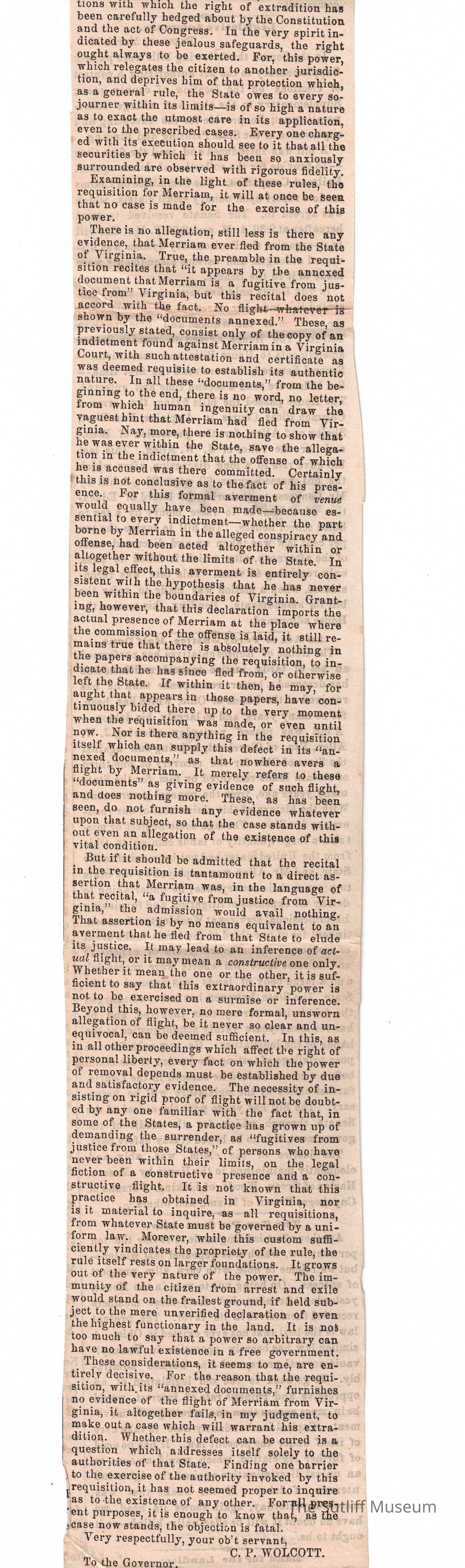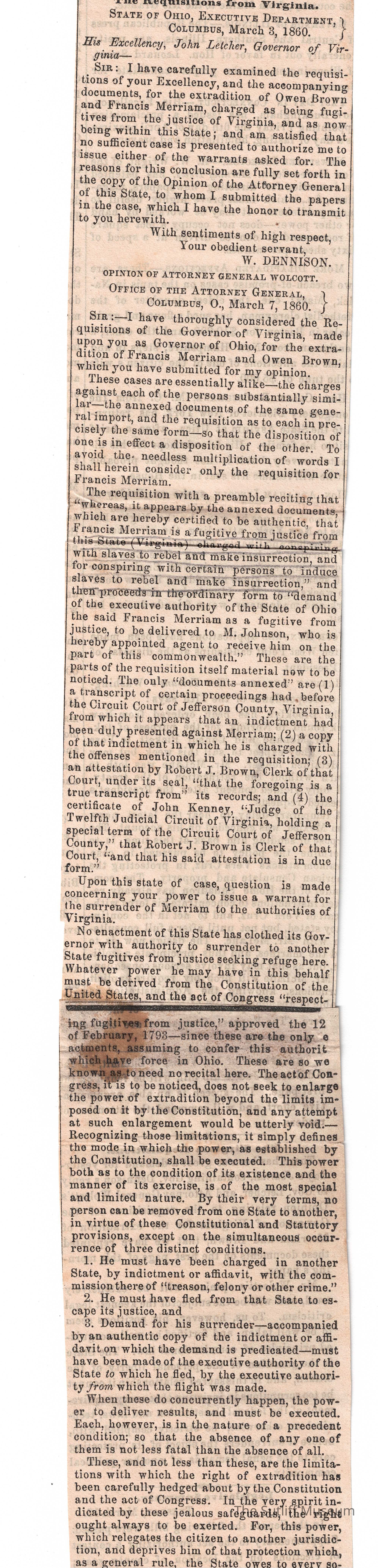 Article detailing the situation of Francis Merrriam, a slave from Virginia who was charged with "conspiring with certain persons to induce slaves to rebel and make insurrection."