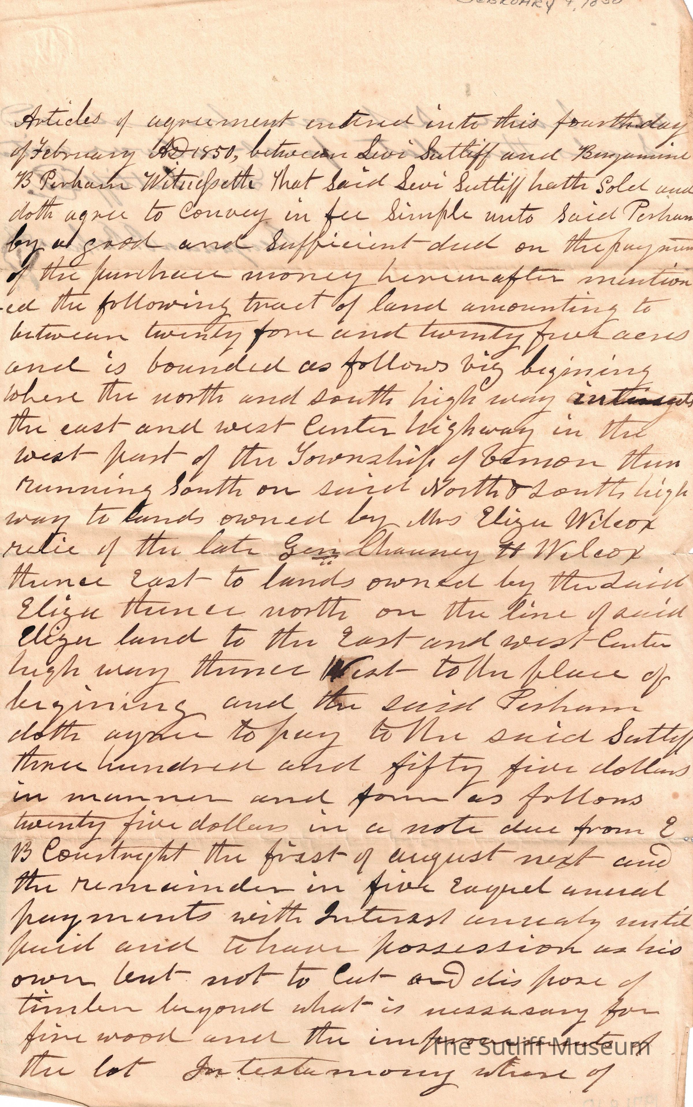 An agreement between [Benjamin B. Perham] to Levi Sutliff regarding the transfer of land.Relationships