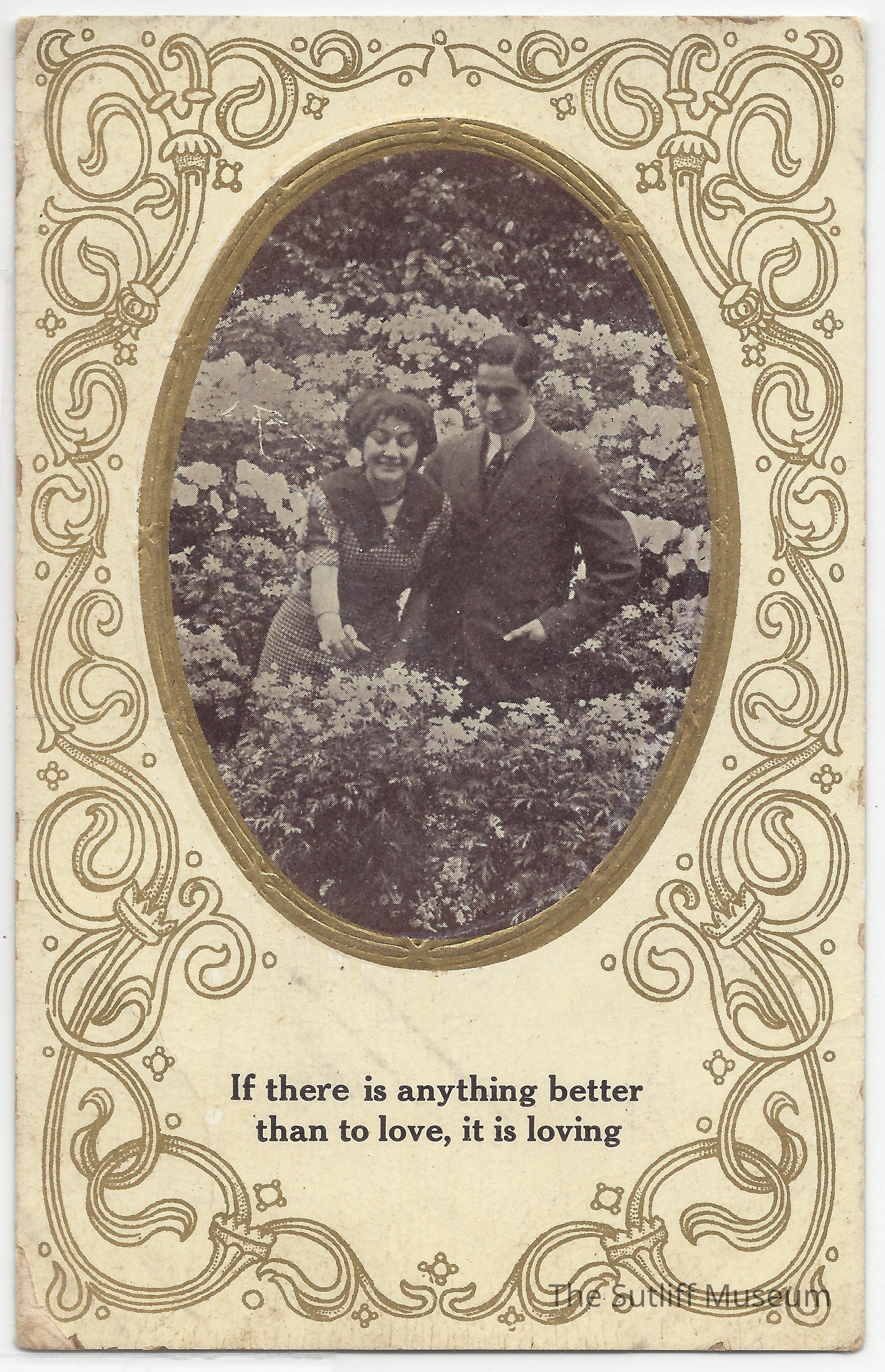 A postcard depicting a man and woman in a flower garden with the phrase "If there is anything better than to love, it is loving" at the bottom.