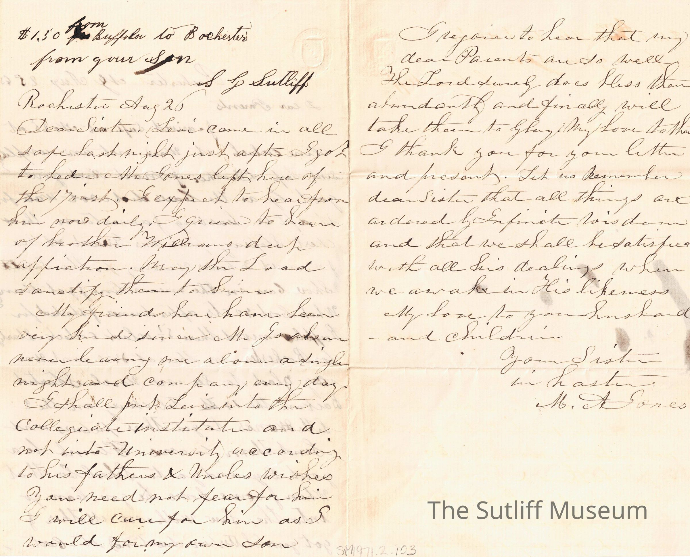 1860s, Business, Travel, Correspondence Between Sutliffs, Family, MoneyDescription