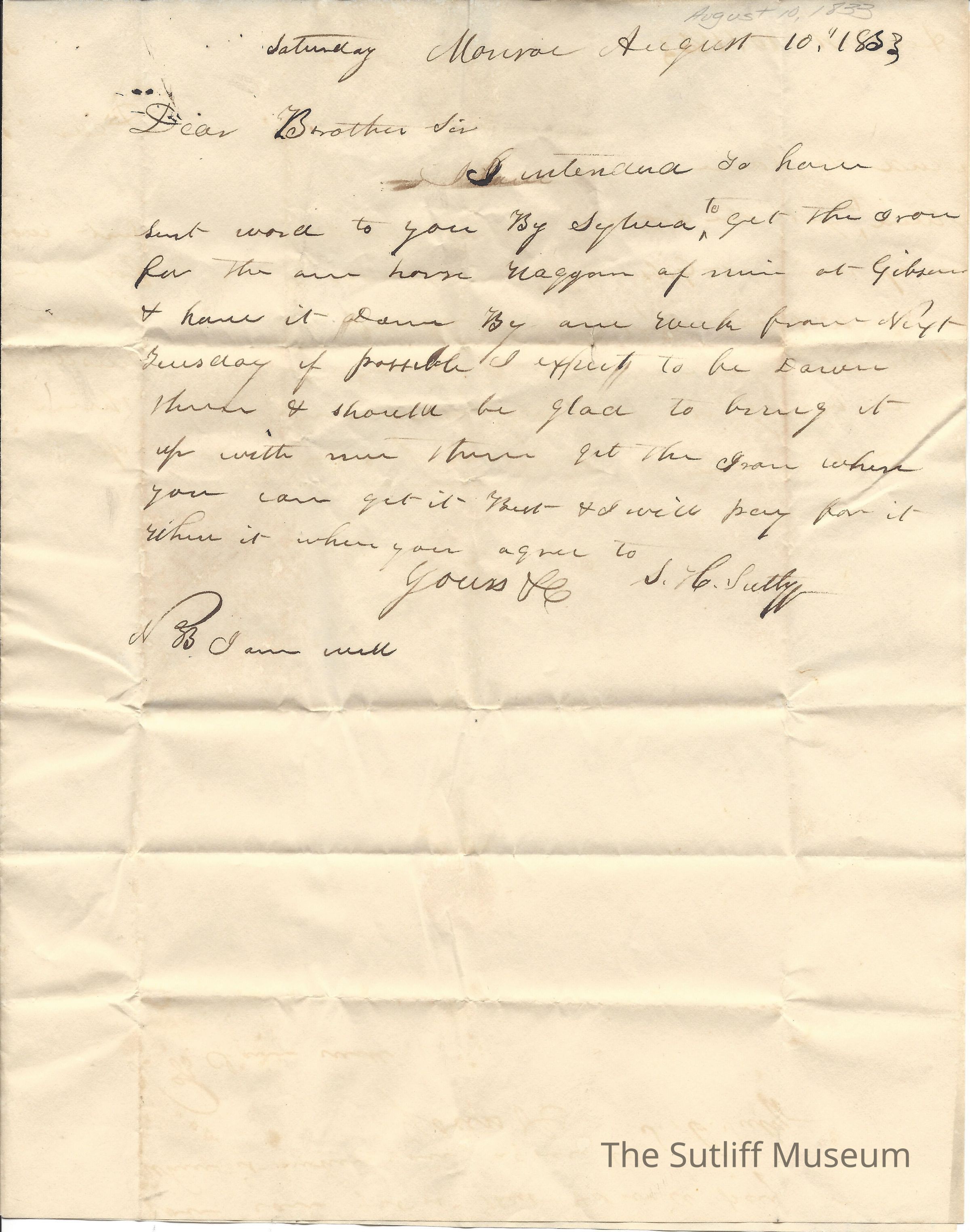 A letter from Samuel Harvey Sutliff to Levi Sutliff regarding the intent to send word and a promise to pay Levi back.Collection