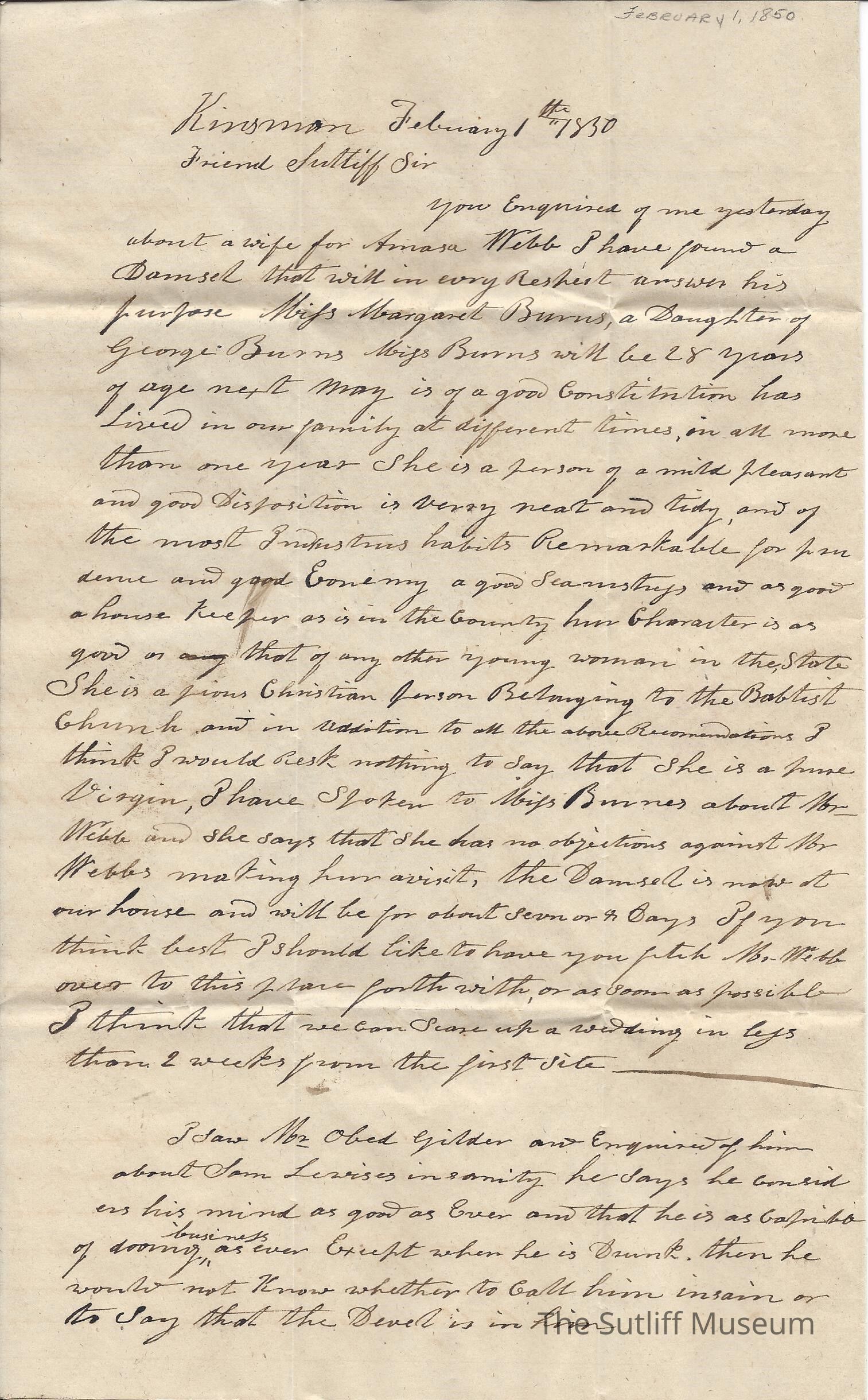 A letter from H. Cole to Levi Sutliff regarding a possible wife for [Amasa] Webb, Margaret Burns.Collection