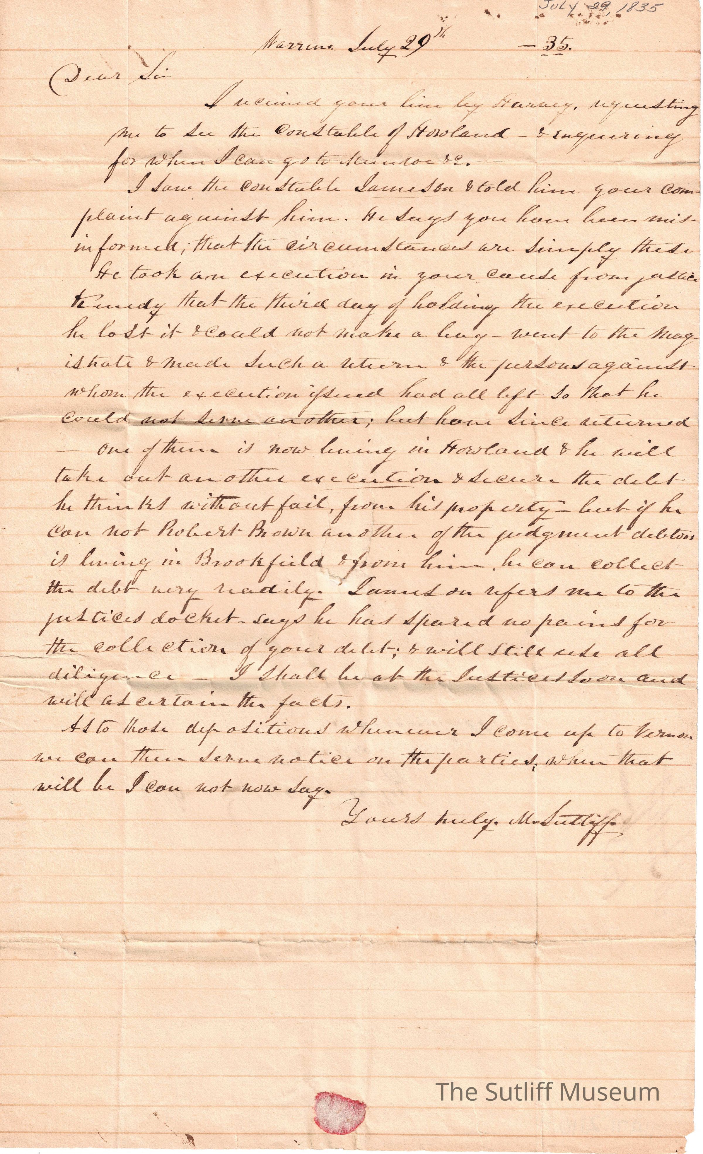 A letter from Milton Sutliff to Levi Sutliff regarding updates on the Constable and legal matters.Collection