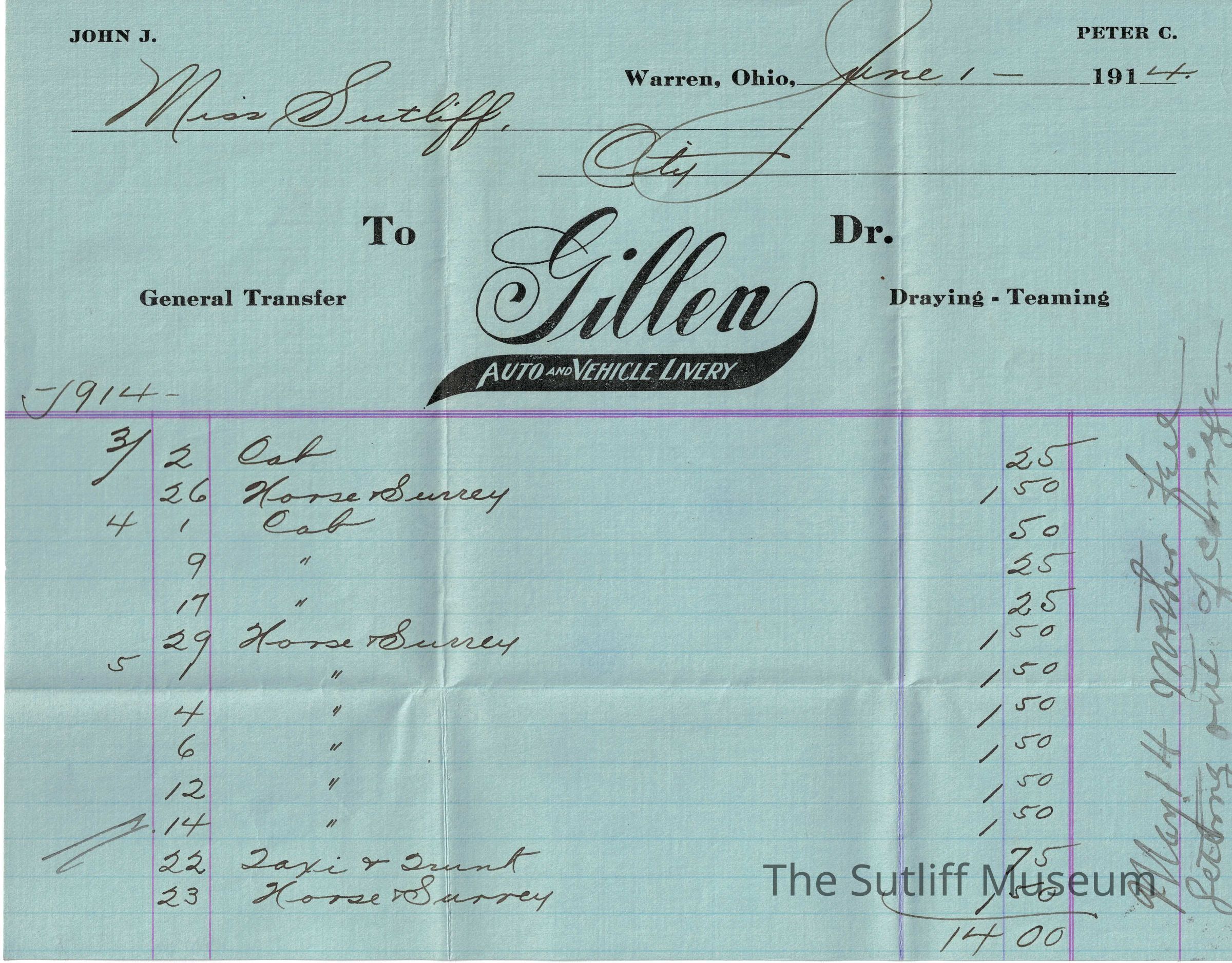 A record of cab/vehicle records used by Phebe L Marvin Sutliff associated with her death receipts.Collection