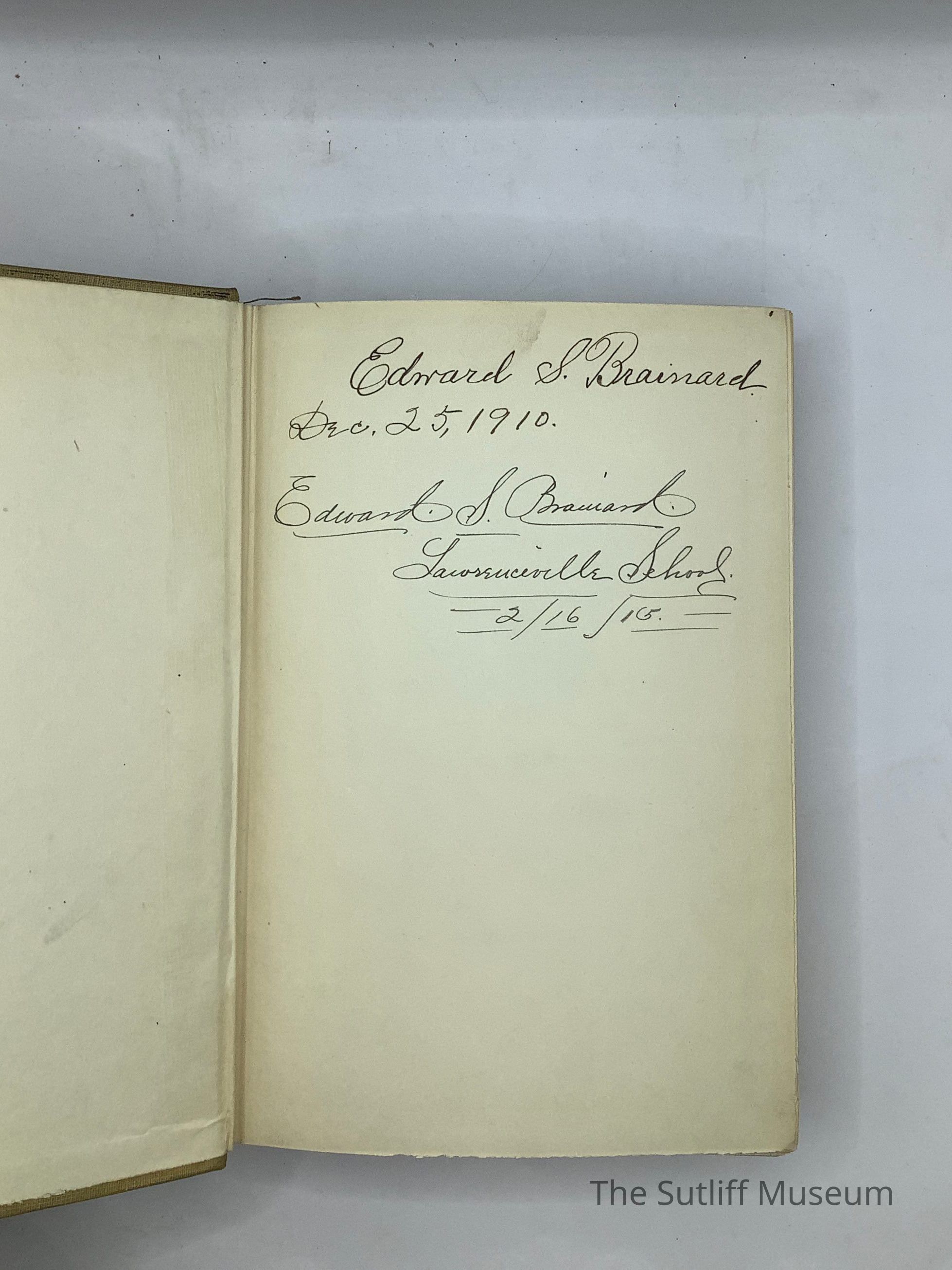 Drap yellow hardbound copy of "The Boys' Life of Abraham Lincoln" by Helen Nicolay. Front cover has an image of the White House in bottom frame, title in center frame, and the dates 1809 1865 with image of log cabin in top frame, bordered in black. Handwritten on first page "Edward S. Barinard Dec. 25, 1910 Edward S. Brainard Lawrenceville School 2/16/15"