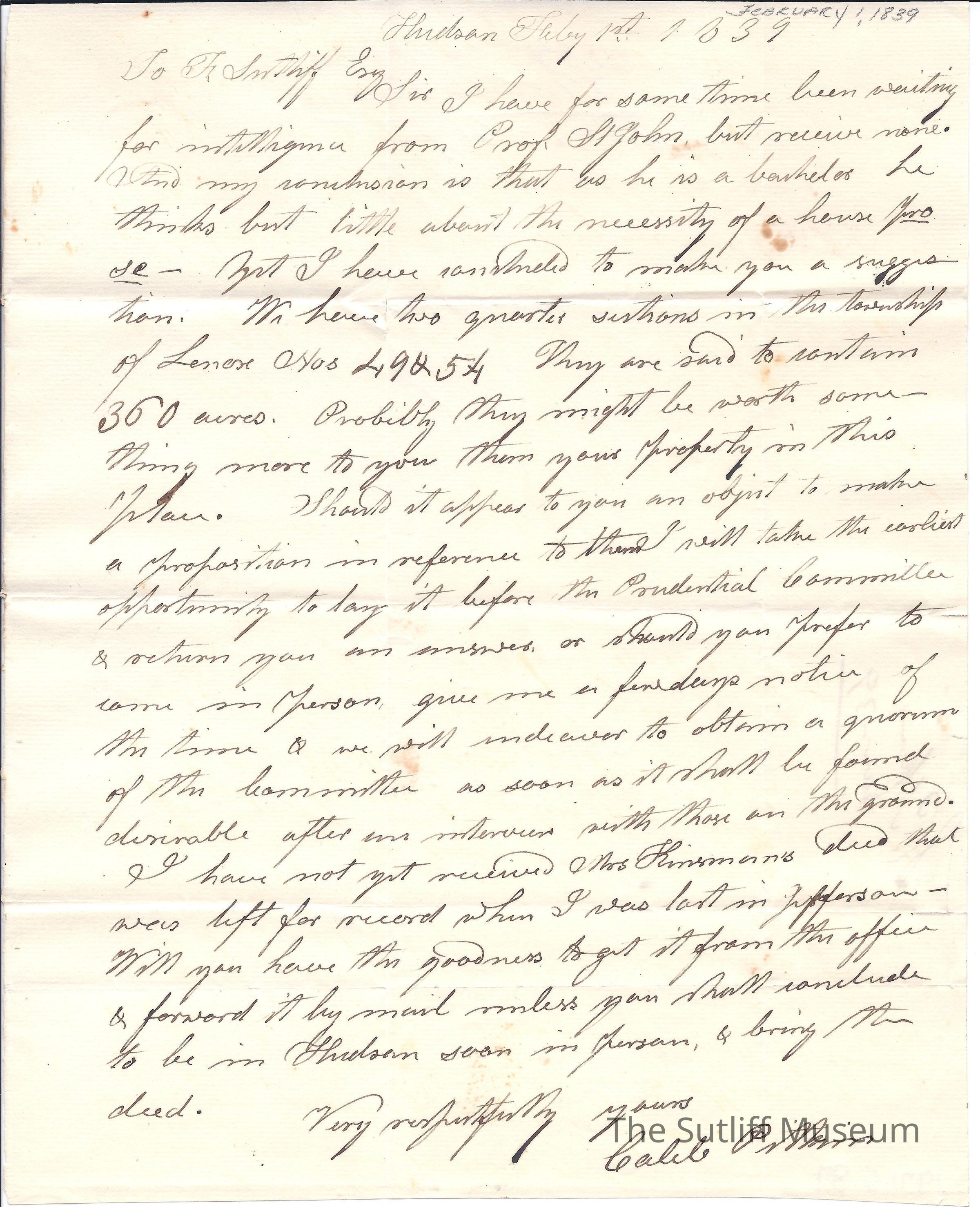 Letter from Caleb Pitkin to Flavel Sutliff regarding the availability of property in Lenox, Ohio.
