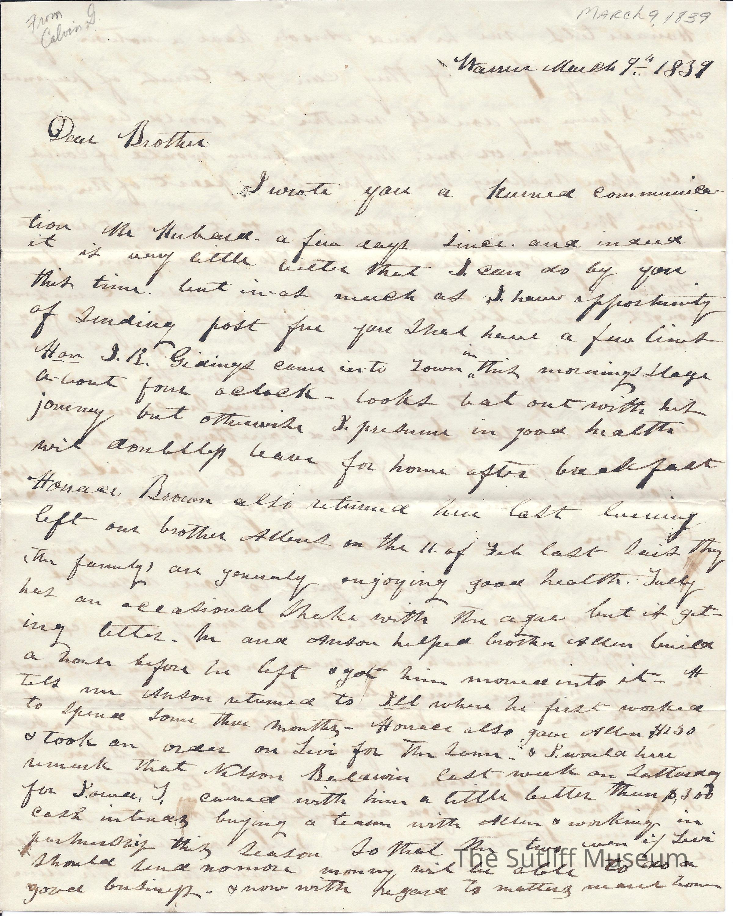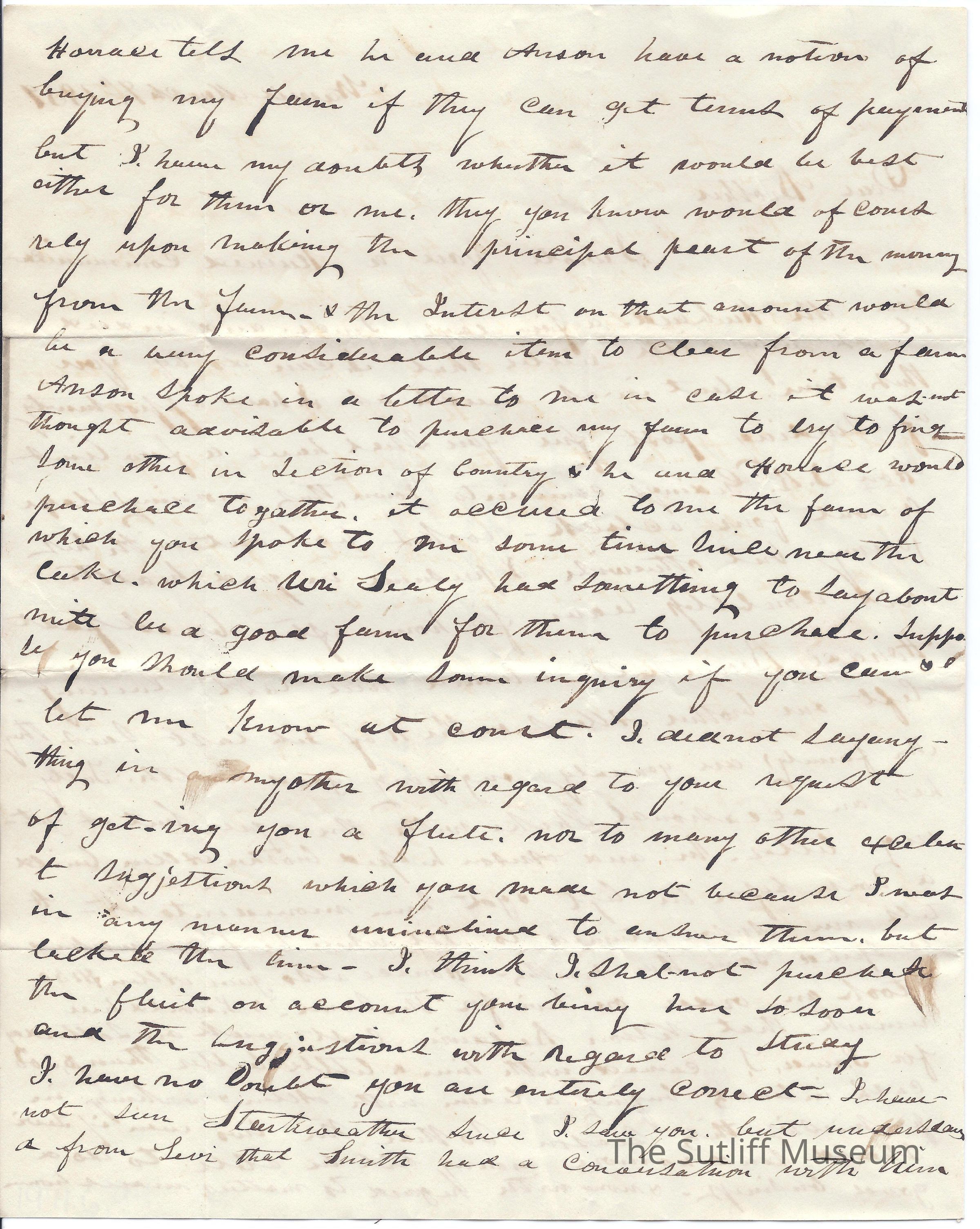 Calvin Sutliff to Flavel Sutliff regarding the potential sale of his farm to Horace Brown.