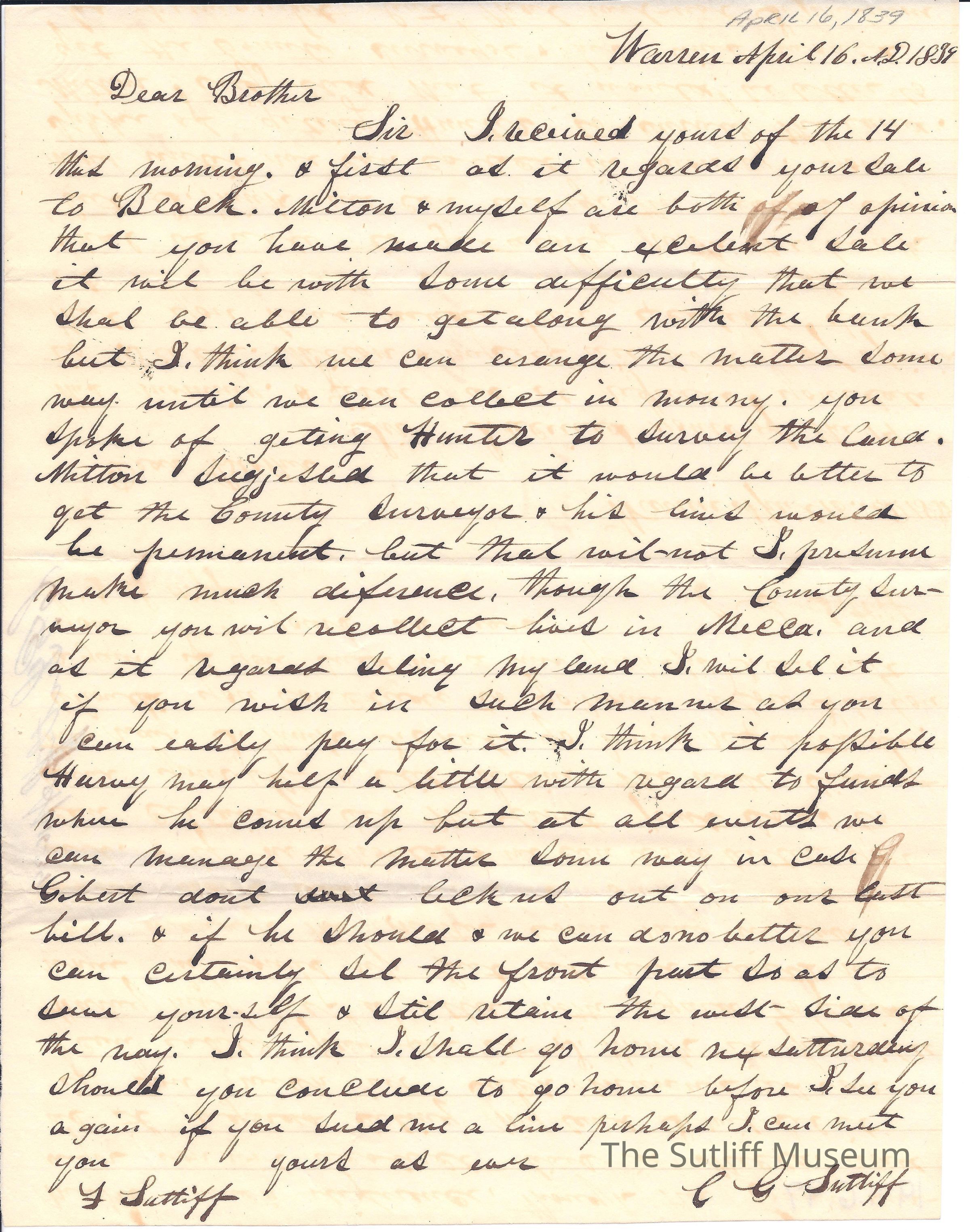 Letter from Calvin Sutliff to Flavel Sutliff regarding the purchase of a parcel of land although it will require extensive financing.Collection