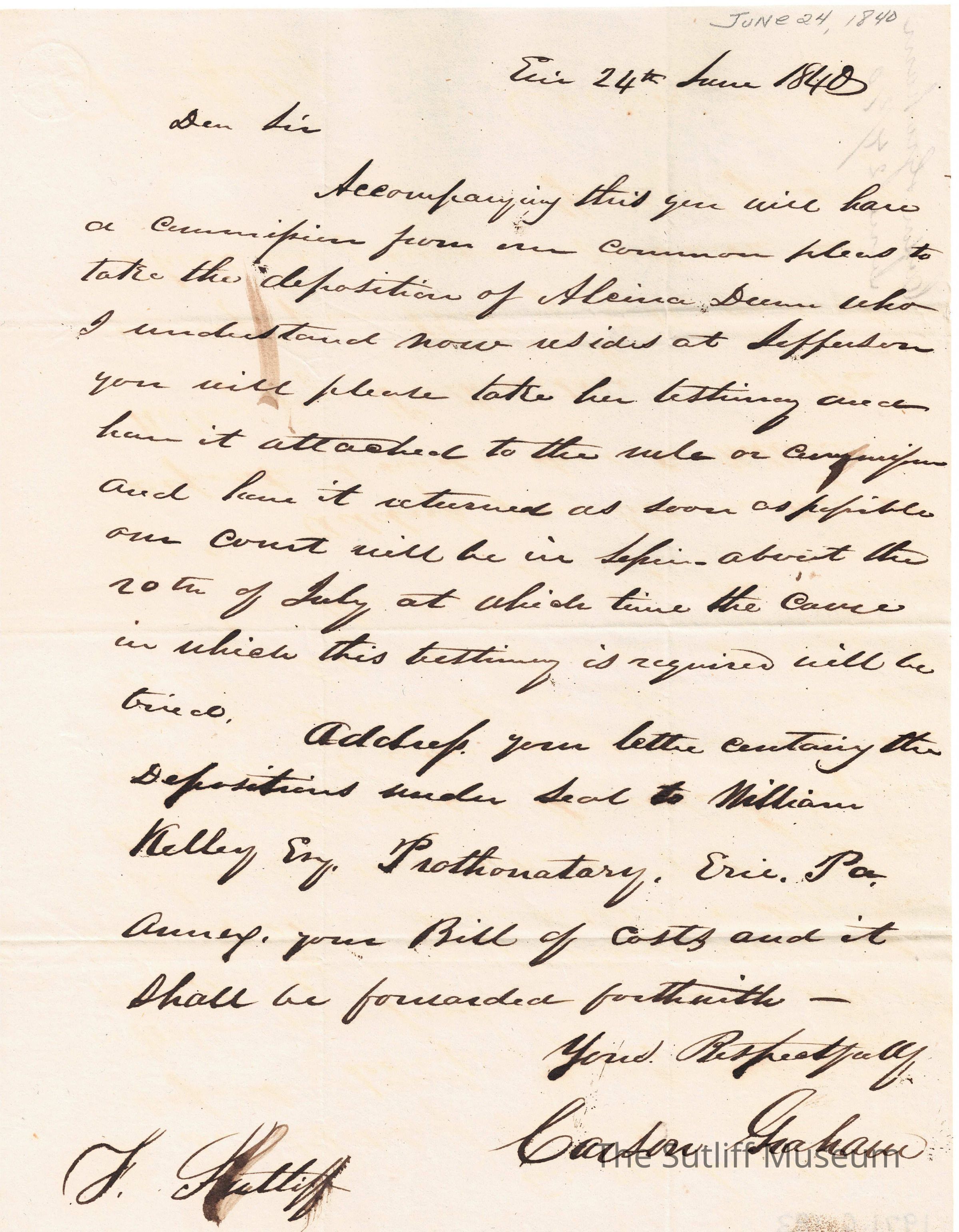 Letter from Carson Graham to Flavel Sutliff asking for a written testimony for a court case.
