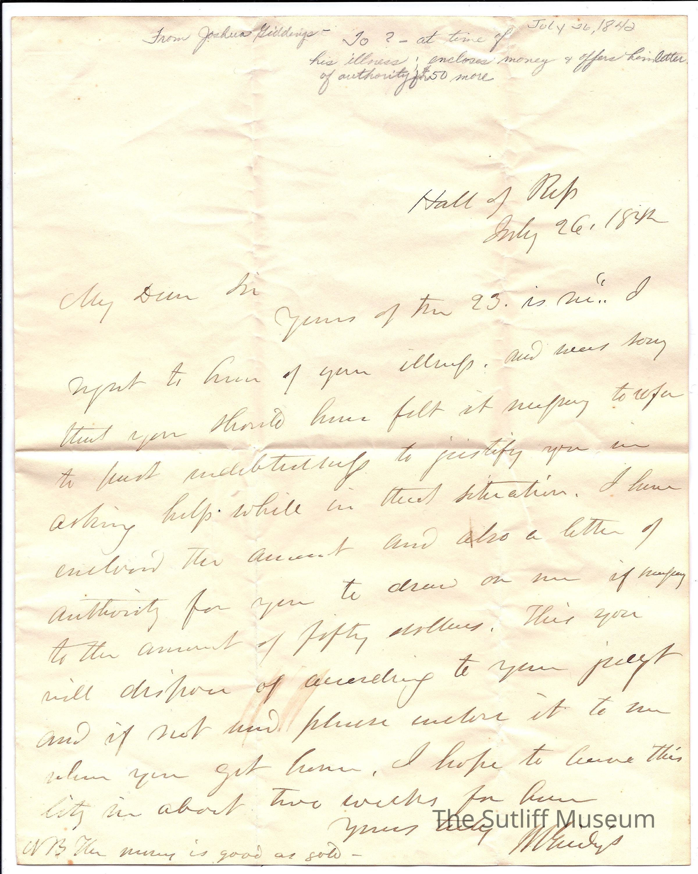 A letter from Joshua Reed Giddings to Unknown regarding illness, enclosed money, and a letter of authority.Collection