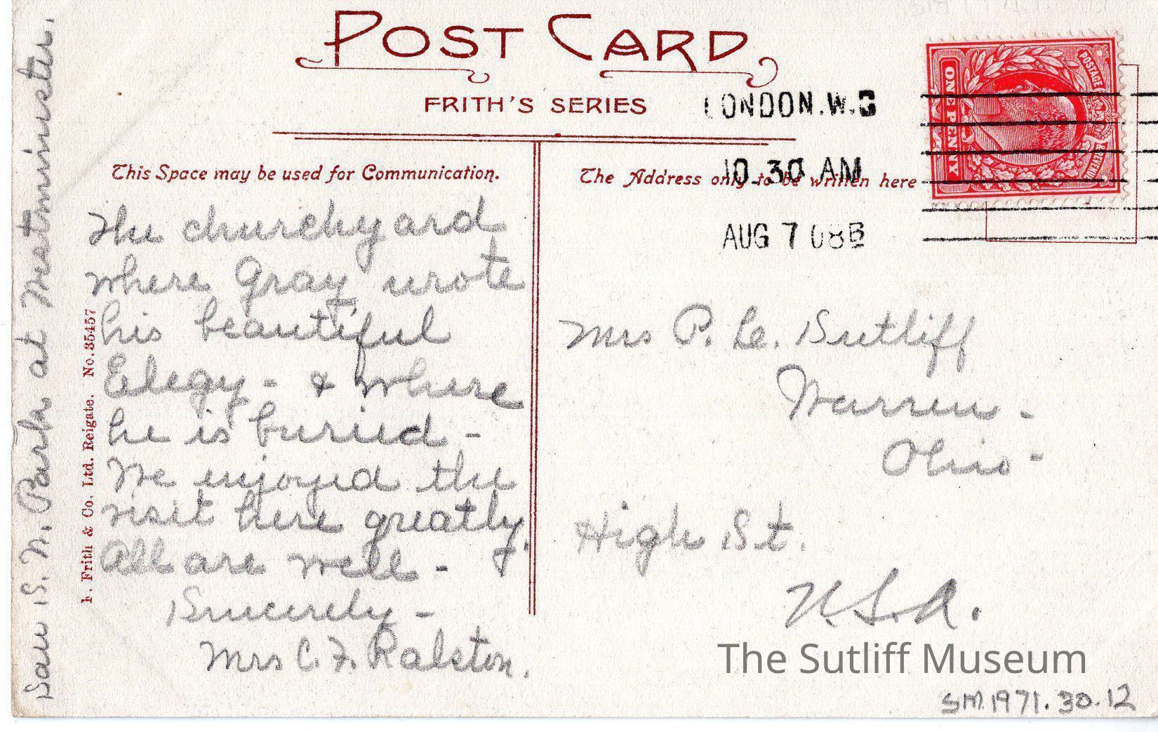 Postcard to Phebe Lord Marvin Sutliff from Mrs. C. Raleton