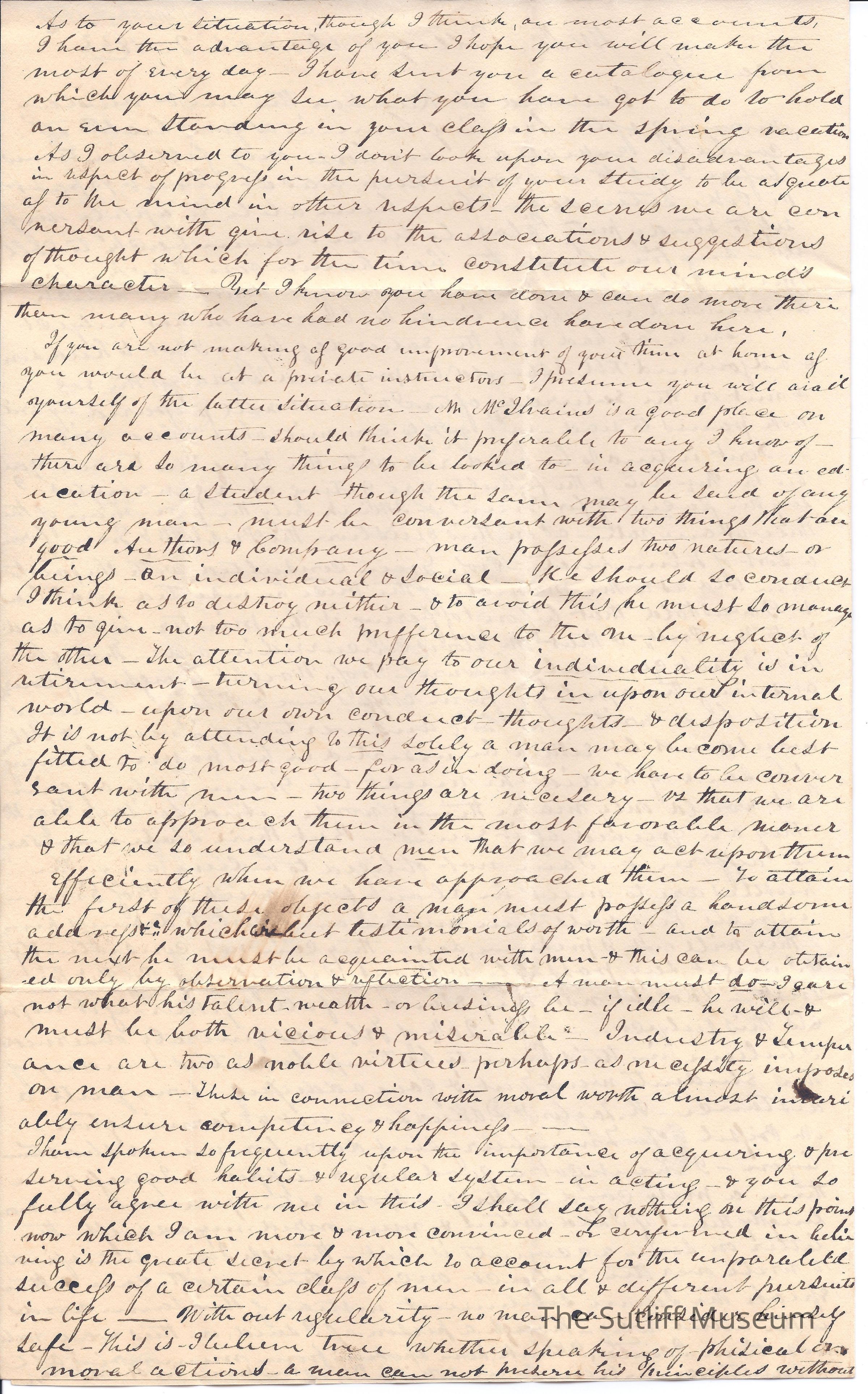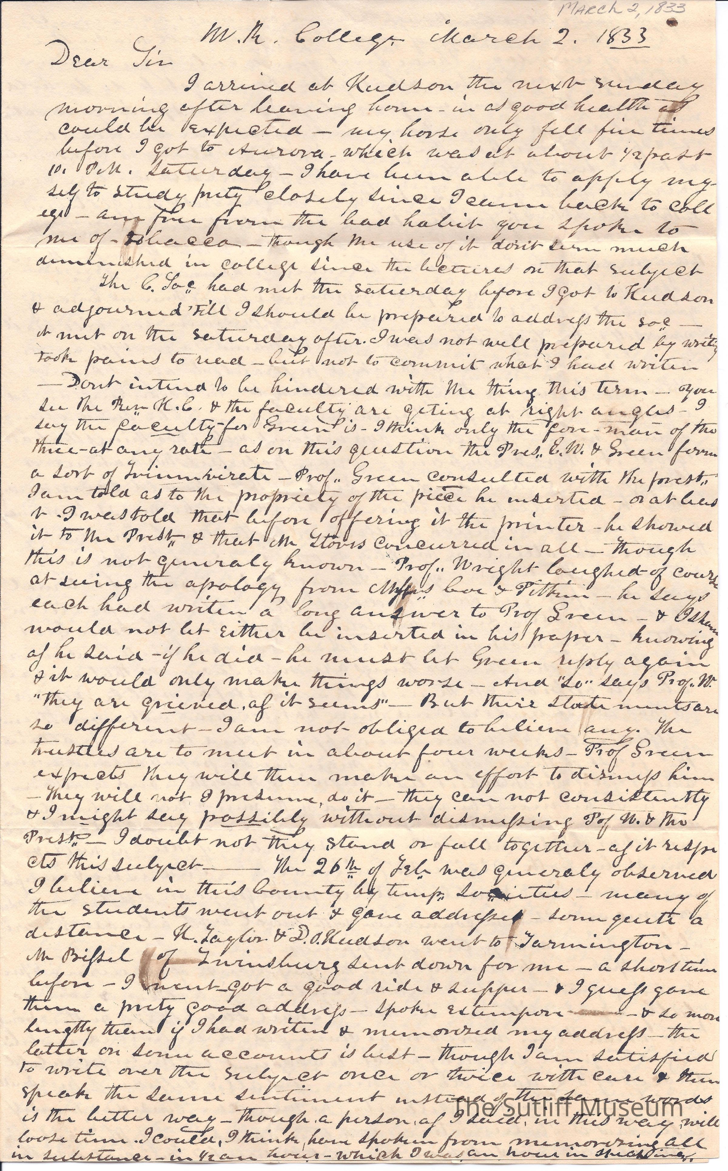 Milton Sutliff to Flavel Sutliff regarding Milton's Trip from Hudson to Aurora, Milton's Address to a Temperance Society, Milton's Advice to Flavel on How to Act and Study, and Milton's Opinion on Calvin and Levi Putting up a House.Collection