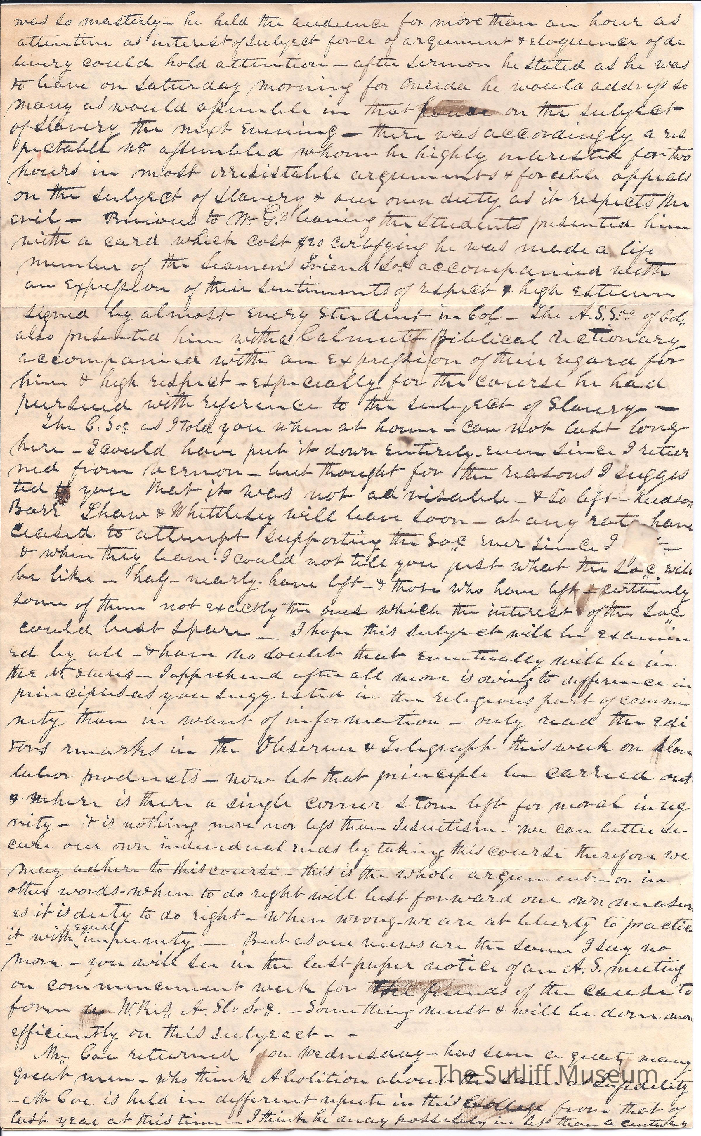 Letter from Milton Sutliff to Flavel Sutliff where Milton discusses formation of an Abolition Society at Western Reserve College.Collection