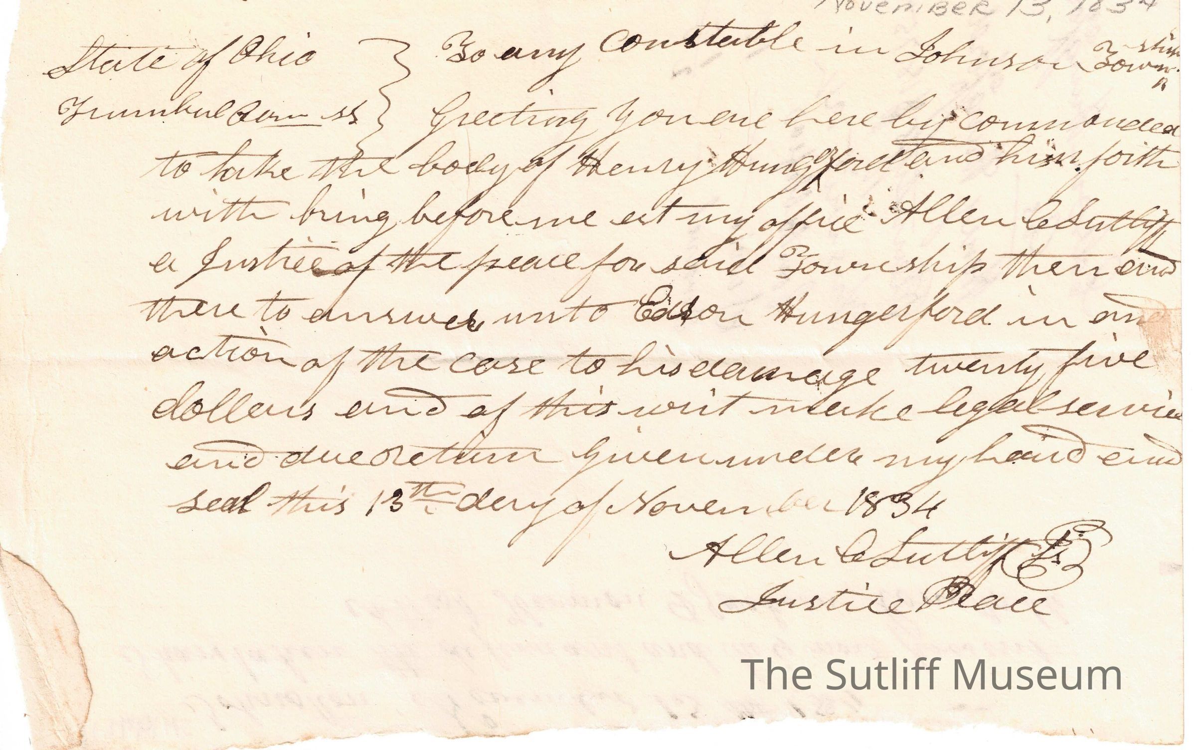 A letter from Allen C. Sutliff about Edson Hungerford on account of him owing money.Relationships