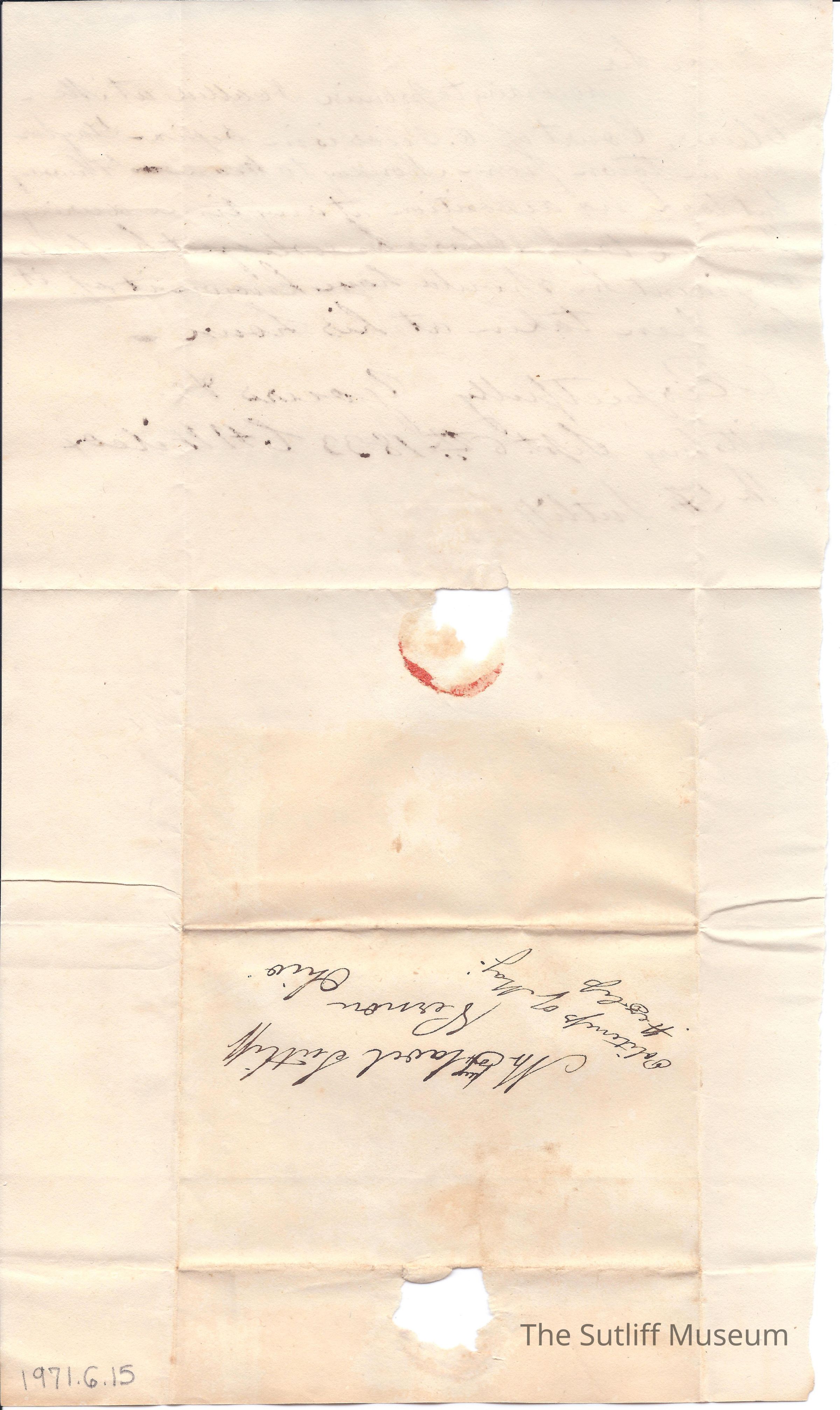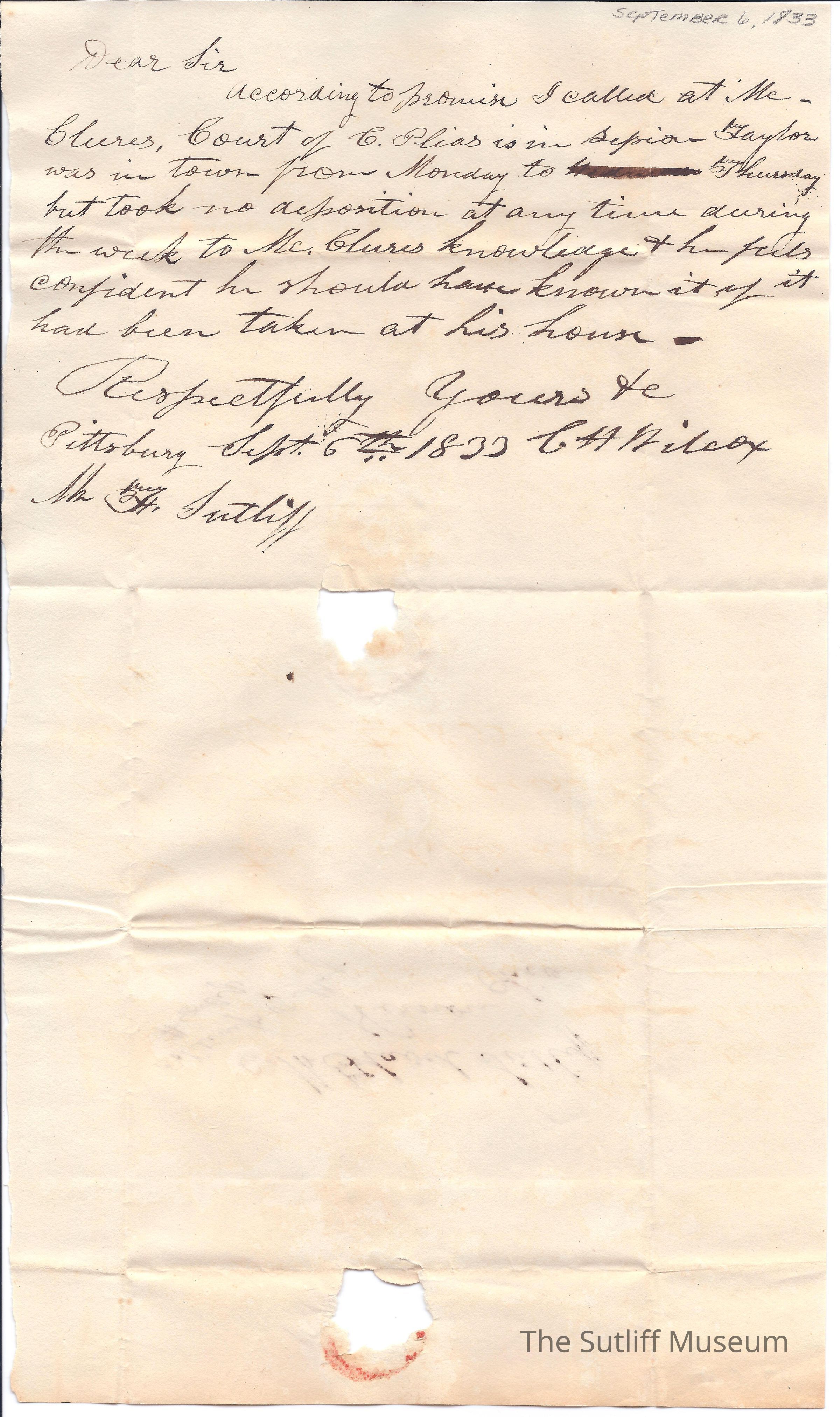 Letter from C.H. [Wilcox] to Flavel Sutliff where he Informs Flavel no deposition taken by Judge Elias.