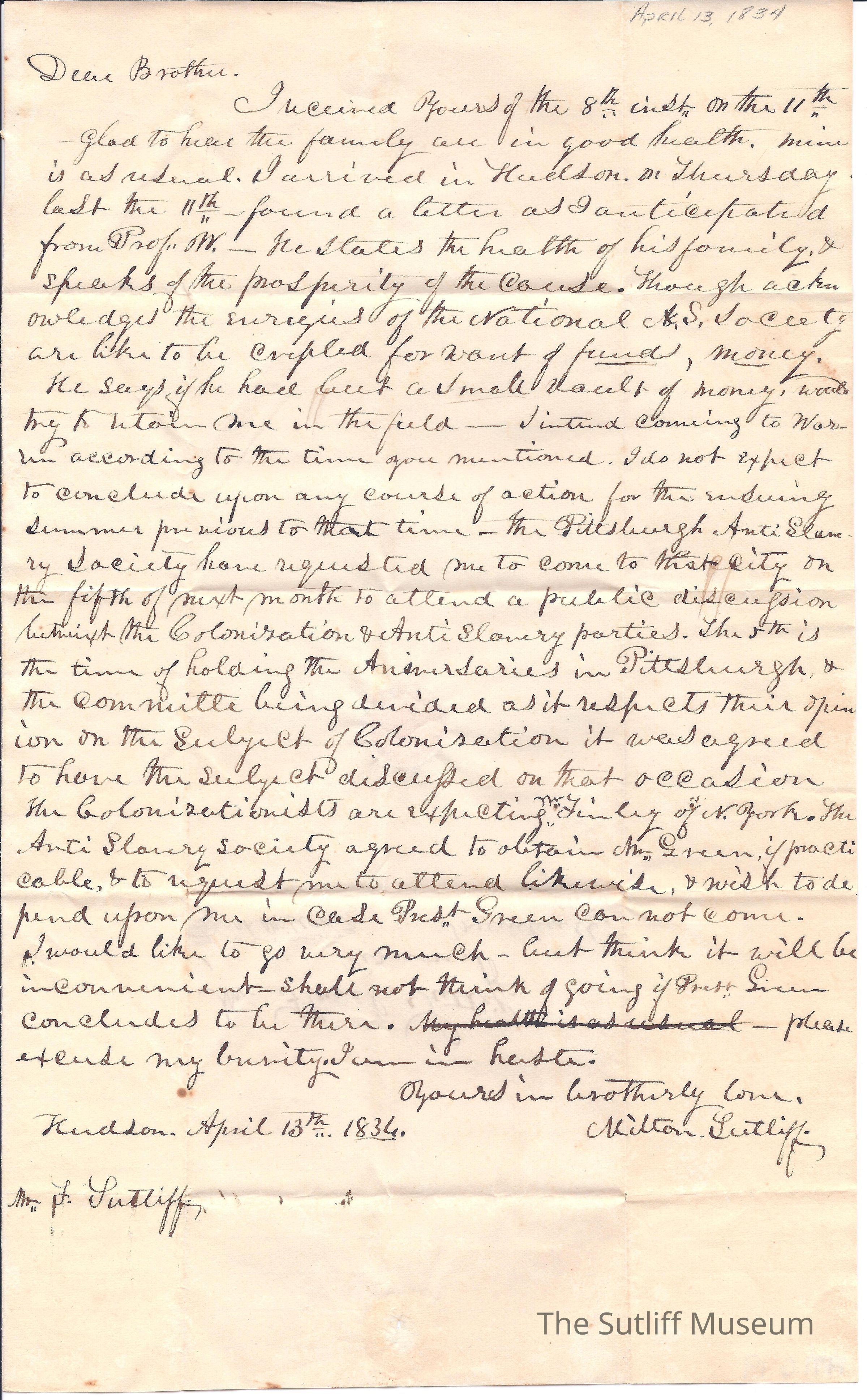 Milton Sutliff to Flavel Sutliff where Milton writes of being invited to attend a Pittsburgh Anti-Slavery Society meeting.Collection