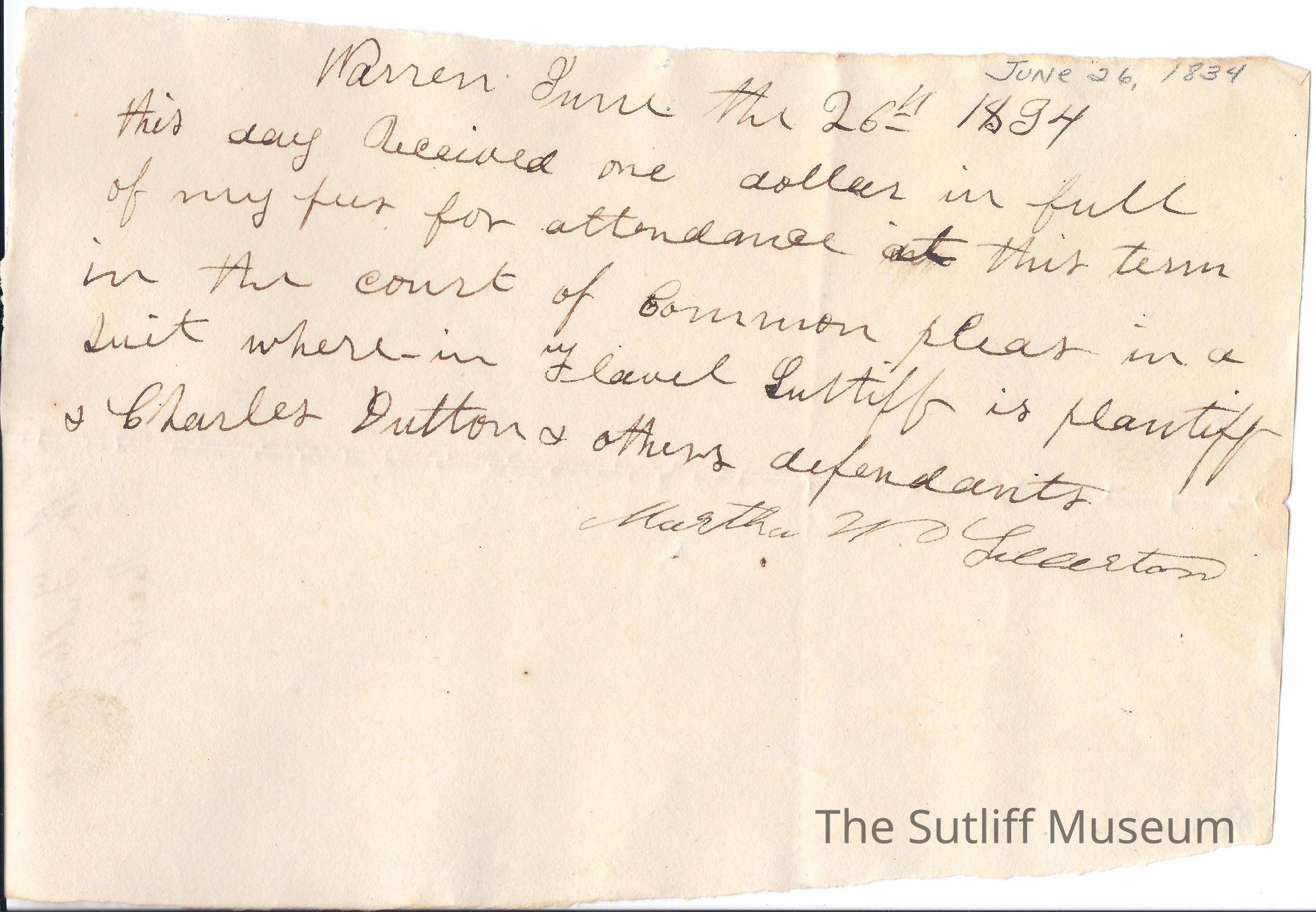 Letter from Martha W. Fullerton to Flavel Sutliff as a receipt for payment for services rendered in Court of Common Pleas. Most likely sent with 1971.6.22 and 1971.6.24.