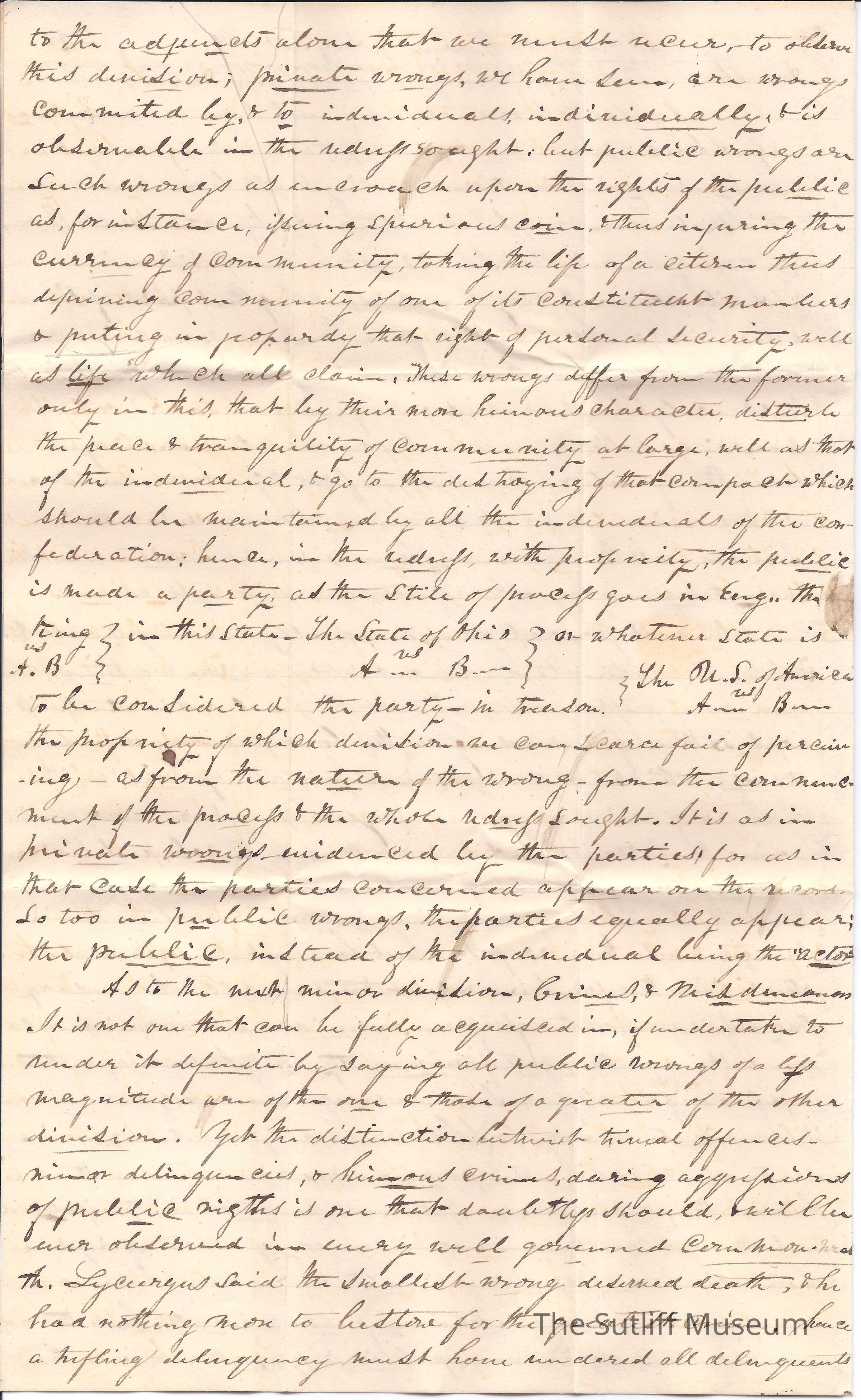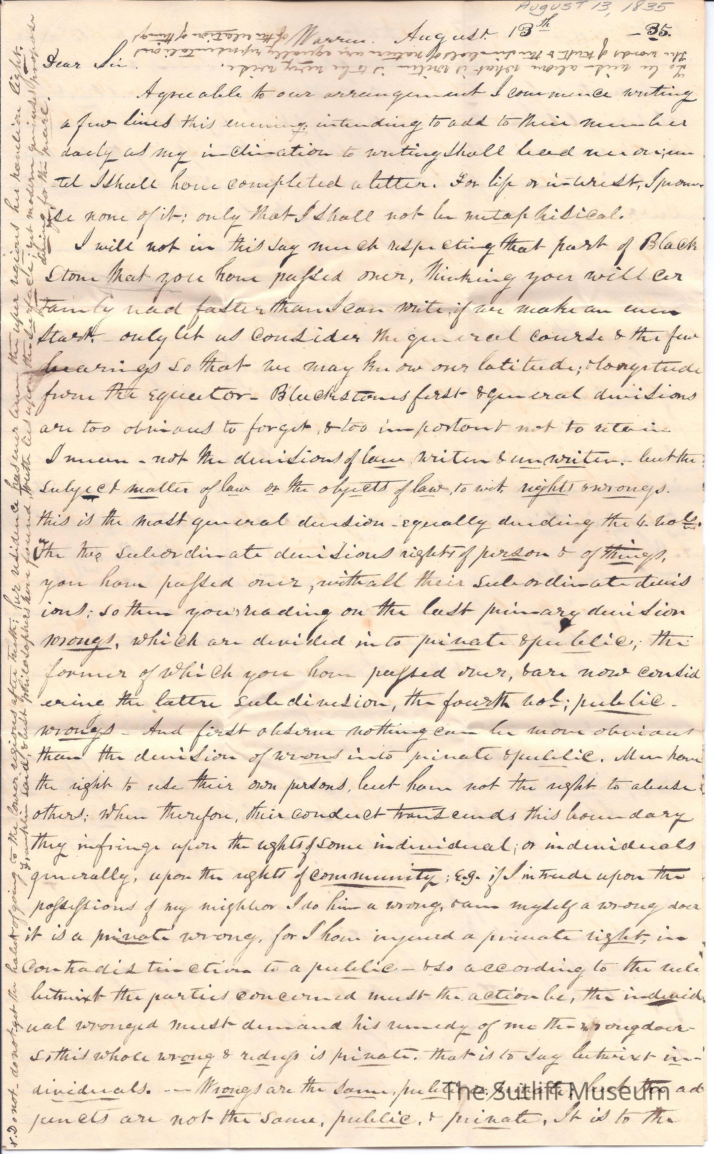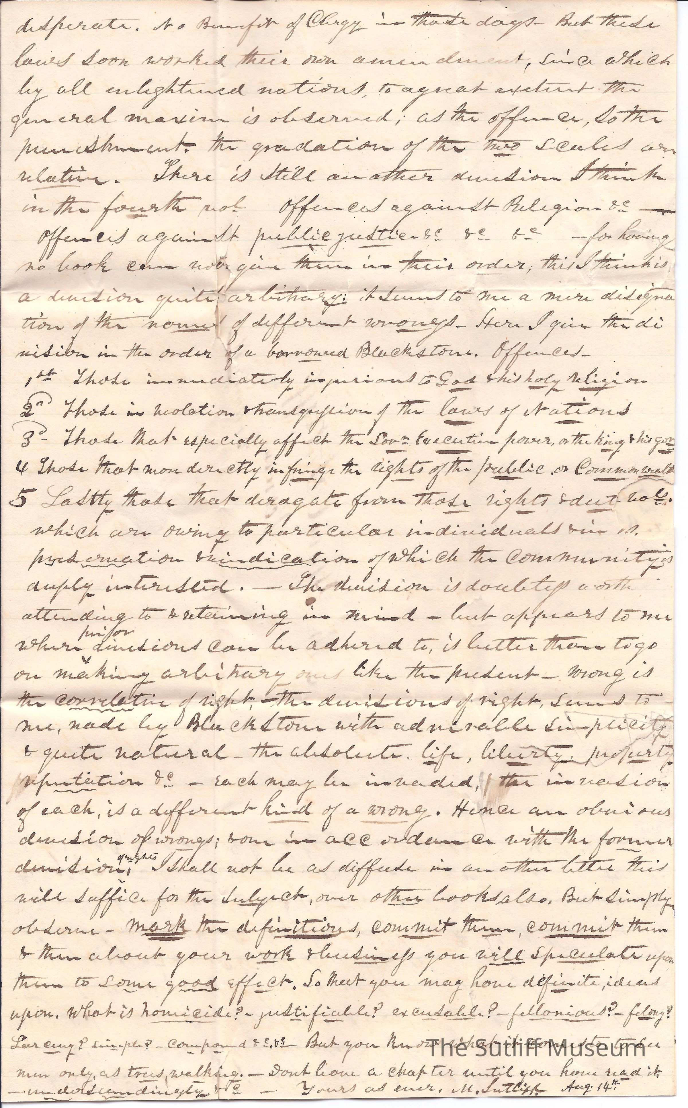 Letter from Milton Sutliff to Flavel Sutliff where Milton shares his opinion on Blackstone's Commentaries about the legal definition of right and wrong and crimes and misdemeanors.Collection