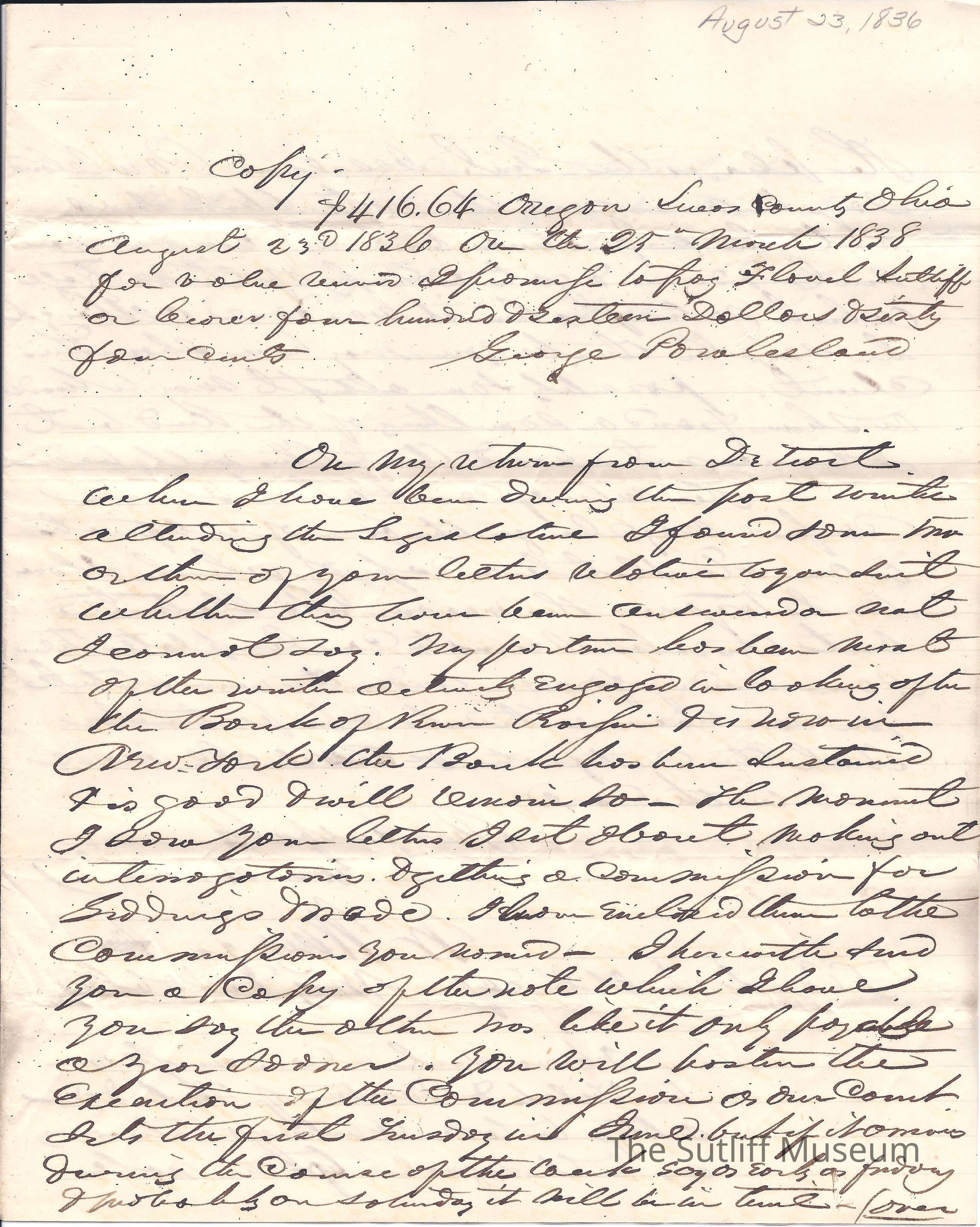 Letter from W. Wiery to Flavel Sutliff. Wiery writes of the dispute between Flavel and a man named Porolesland over the validity of a note.