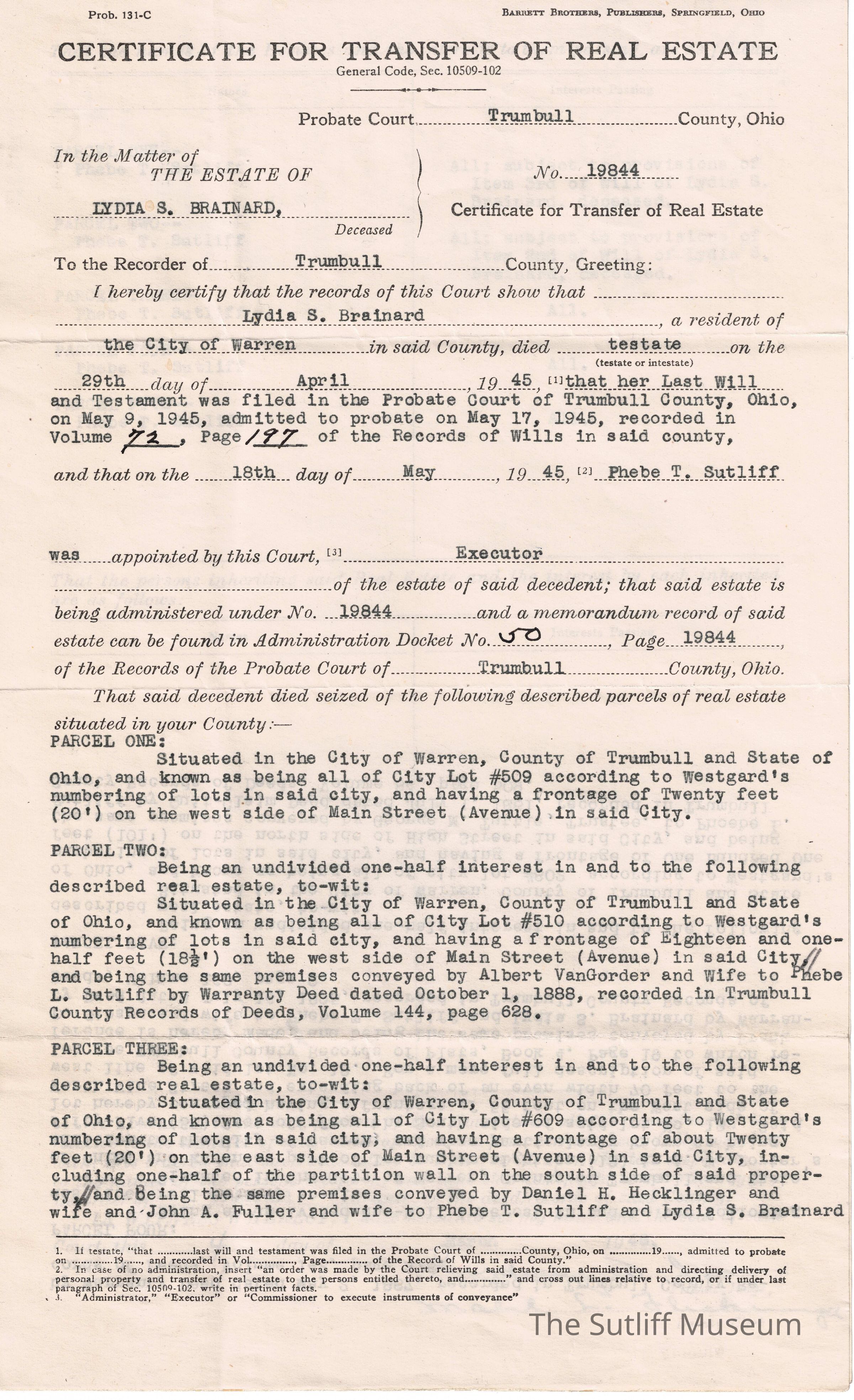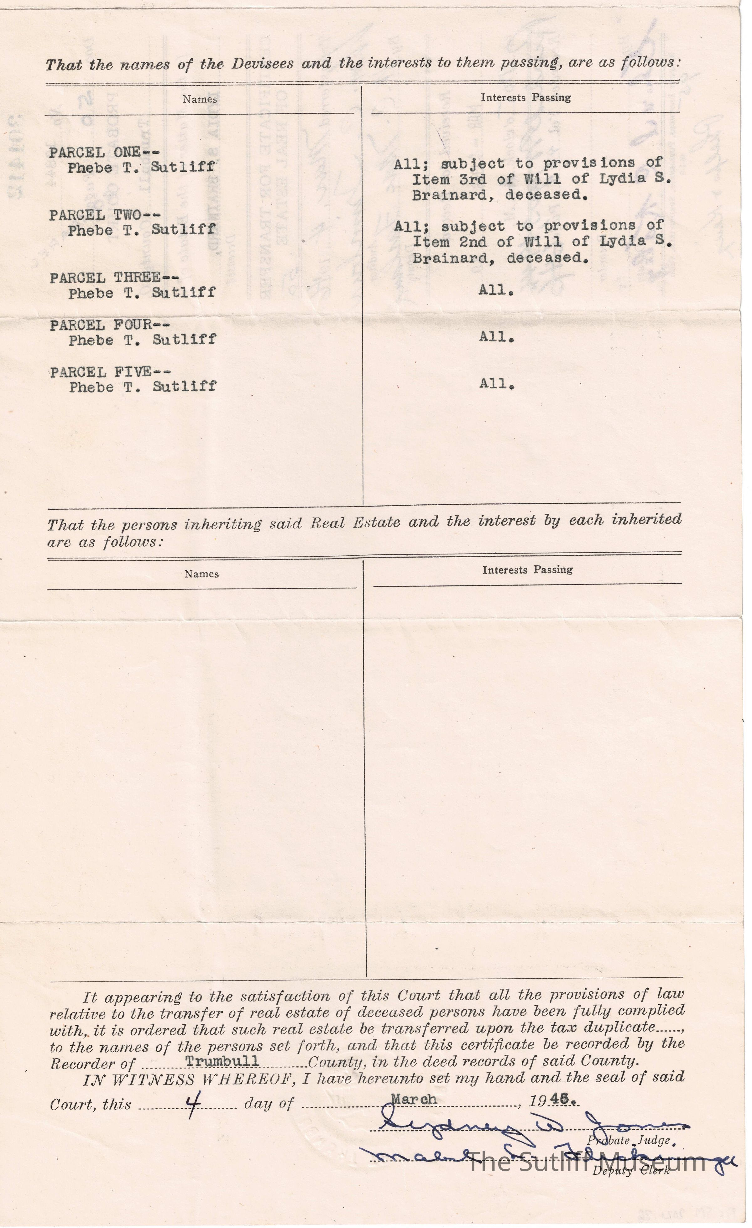 A Certificate for Transfer of Real Estate regarding the estate of Lydia S. Brainard to Phebe Temperance Sutliff after her death.Relationships