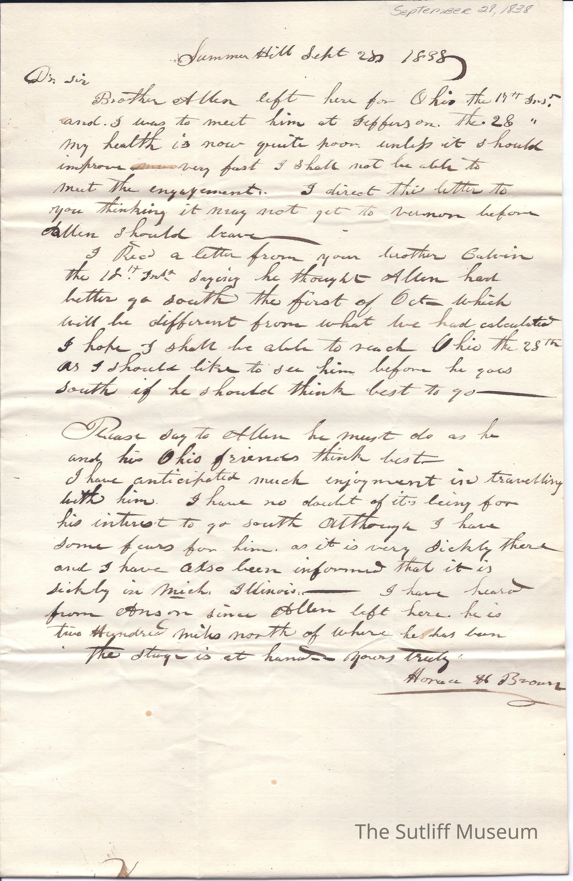 Letter from Horace H Brown to Flavel Sutliff. Horace writes that he is ill and may not make it to Ohio to meet his brother Allen and Flavel. Says if he doesn't make it to have Allen act as he sees fit.