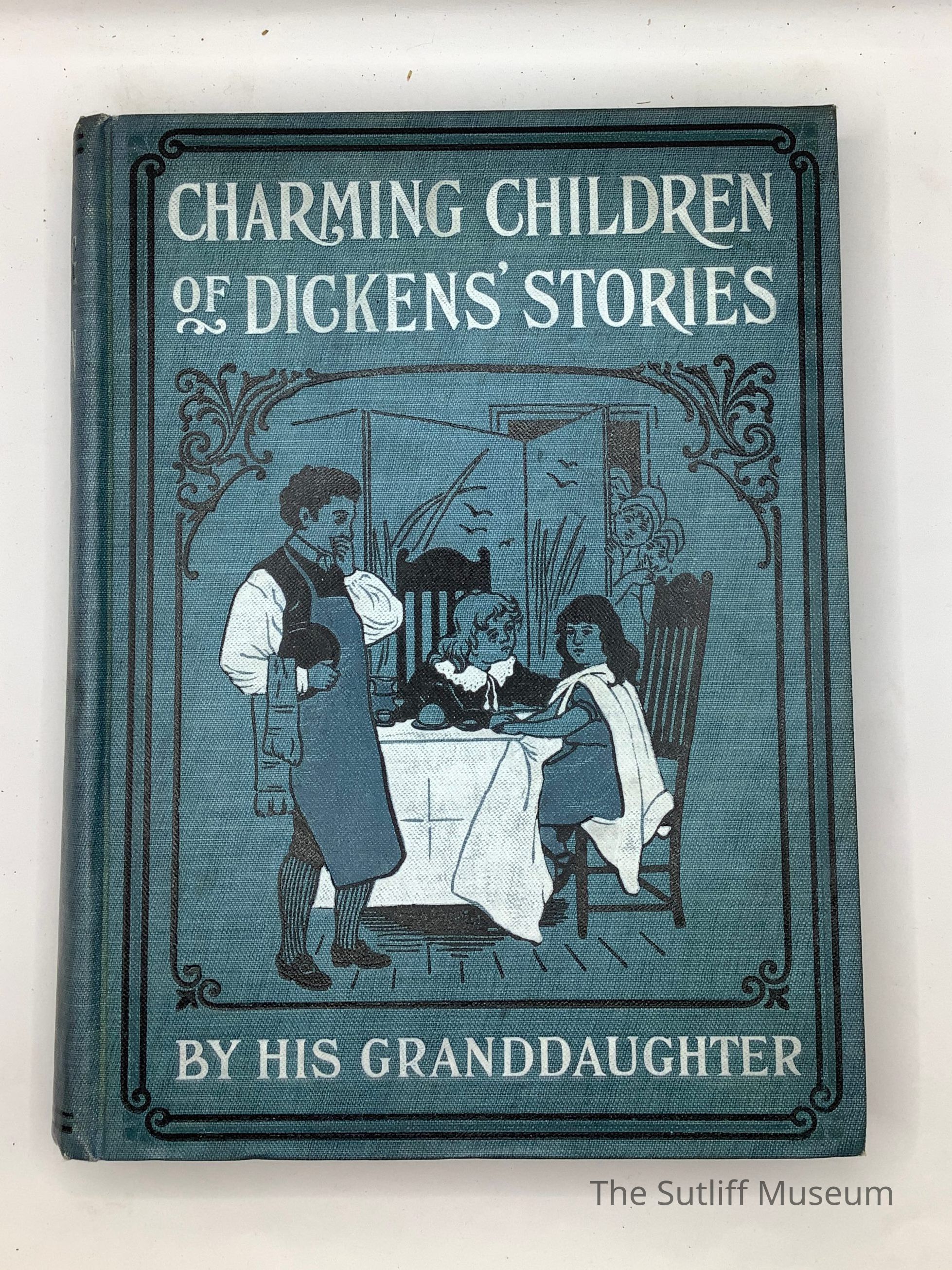 Blue cloth hardbound copy of Charming Children of Dicken's Stories with white embossed title and authors name on front cover along with an image of two children sitting at dinner table and servant with black border. Handwritten inscription reads "Edward S. Brainard Dec. 25, 1907."