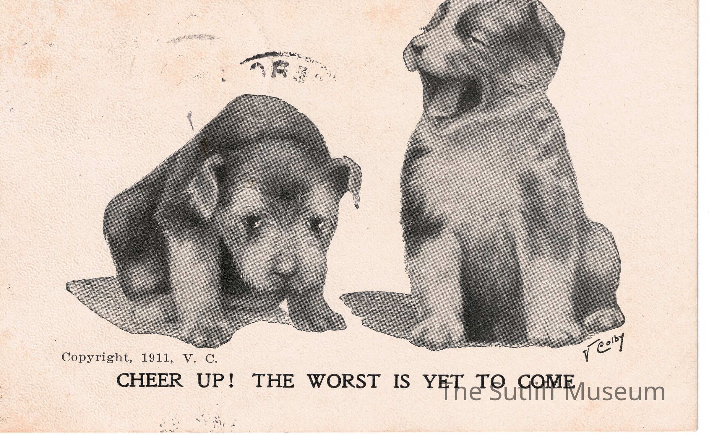 A postcard with two dogs and the phrase "Cheer Up! The Worst is Yet to Come"